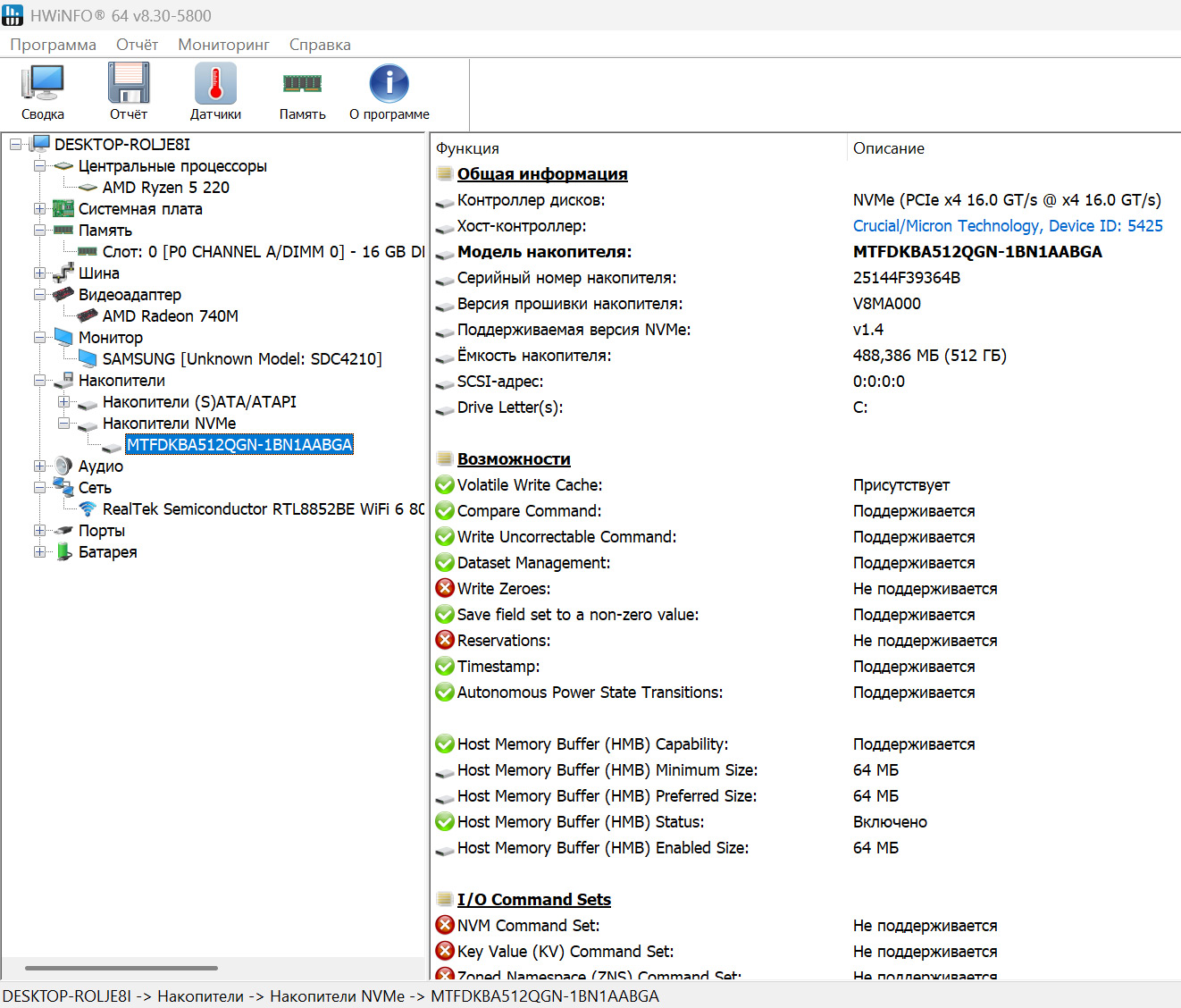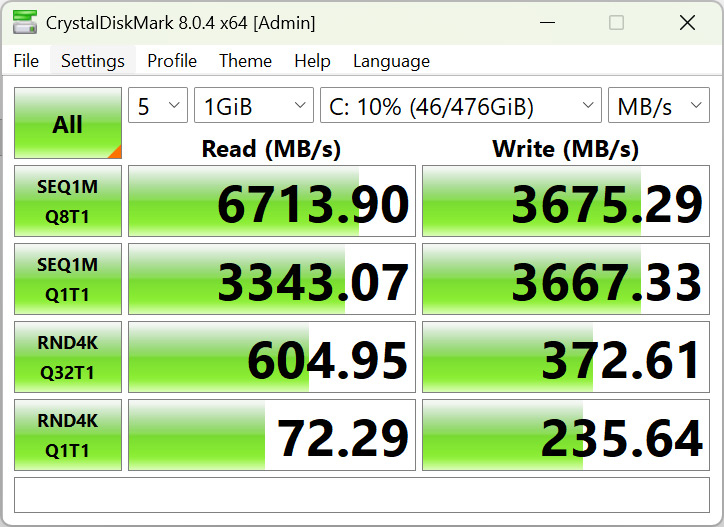 С накопителем тут все довольно бодро. Стоит SSD от Micron на 512 ГБ с интерфейсом PCIe 4.0. В тесте CrystalDiskMark он выдает 6700 МБ/с на чтение и 3600 МБ/с на запись. По‑моему, это очень даже ничего для обычного ноутбука.