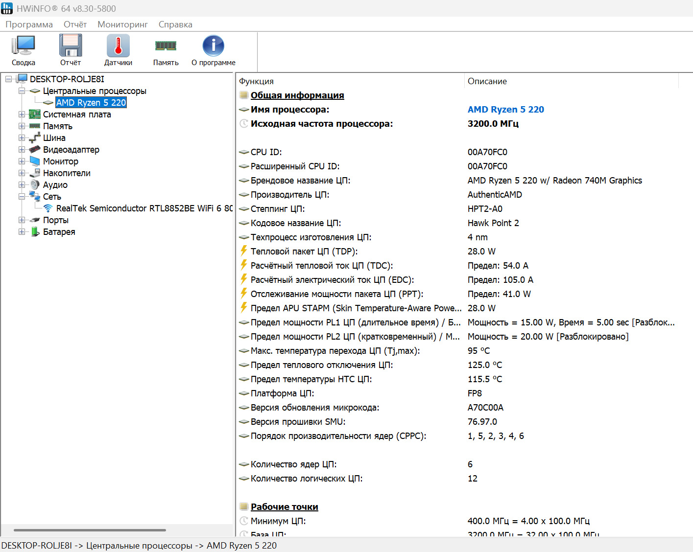 AMD Ryzen 5 220 — шестиядерный процессор с поддержкой 12 потоков, представленный 6 января 2025 года. Изготовленный по современному 4-нм техпроцессу, он отличается высокой энергоэффективностью. Базовая частота — 3,7 ГГц, в турбо-режиме — до 4,9 ГГц, с заблокированным множителем. TDP процессора варьируется от 15 до 28 Вт в зависимости от конфигурации.