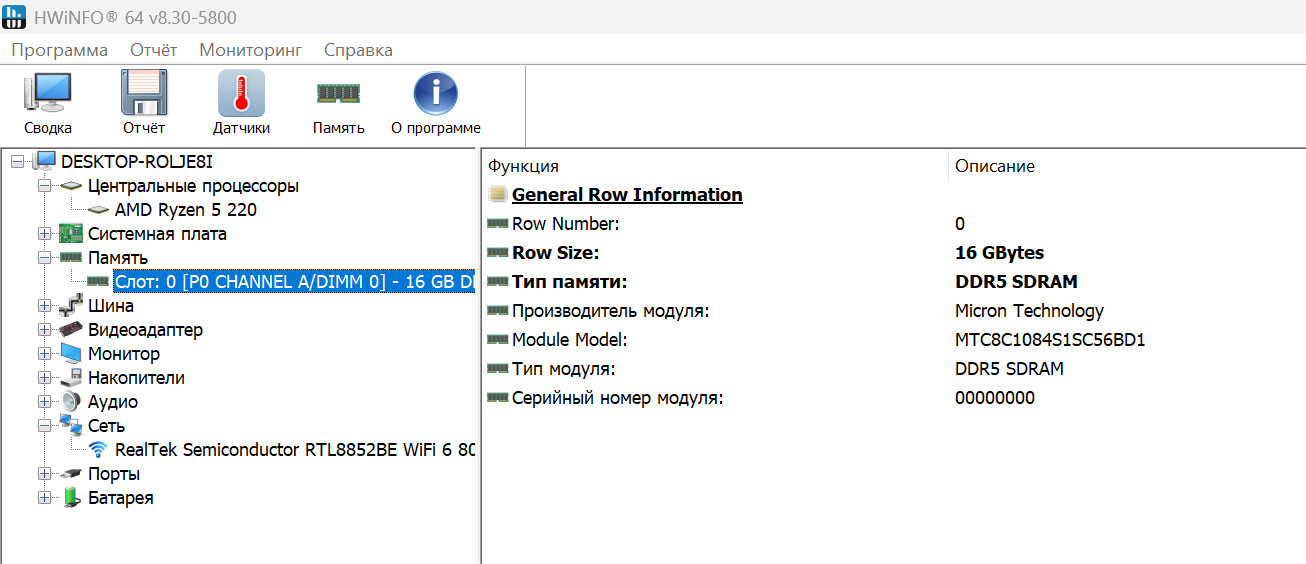 Вот с оперативкой тут, знаете, довольно любопытная схема. По умолчанию вам уже «на борту» дают 16 ГБ DDR5 от Micron — и это, в принципе, разумный задел для большинства задач. Но самое приятное — вам не придется мириться с этим объемом навеки. Есть один слот, куда можно воткнуть еще одну планку на 16 ГБ.