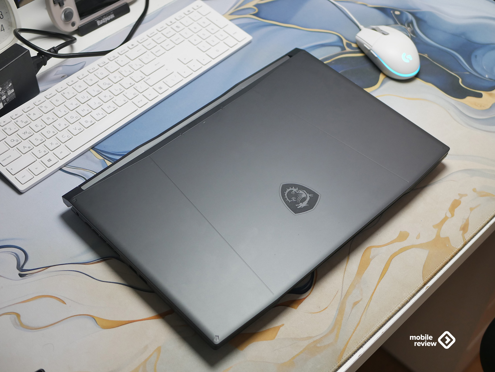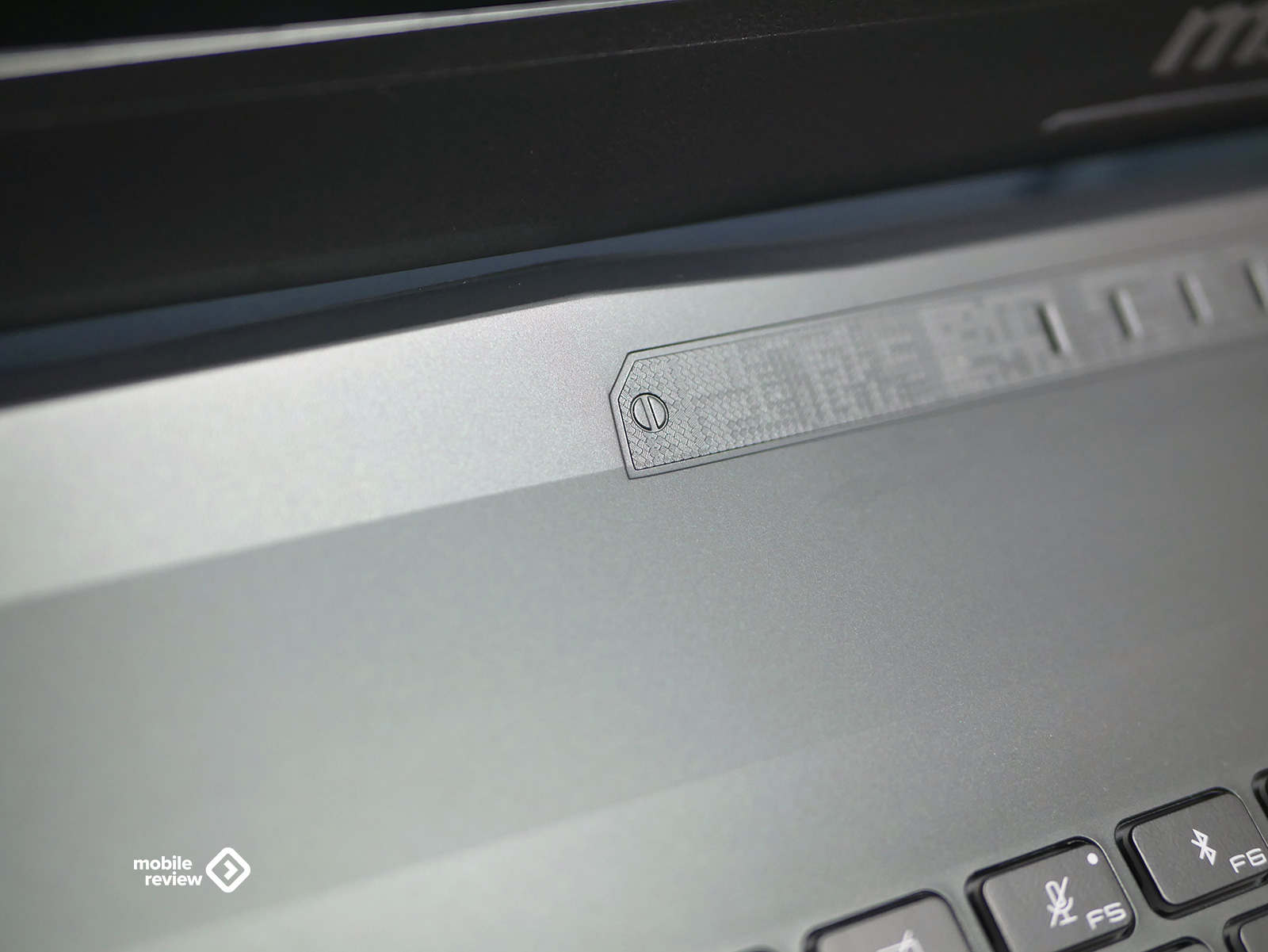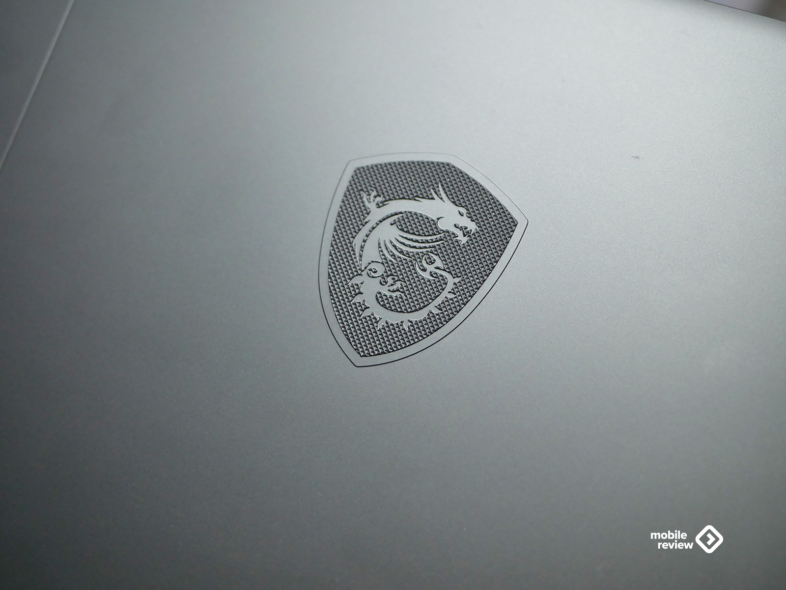 Верхняя часть матовая, приятная на ощупь. В центре — фирменный логотип MSI в виде щита с драконом. Думаю, символика здесь очевидна: щит — это про надежность и защиту, а дракон — про силу и энергию. Получается, не просто декоративная деталь, а небольшой манифест в духе «мощь, но с характером».