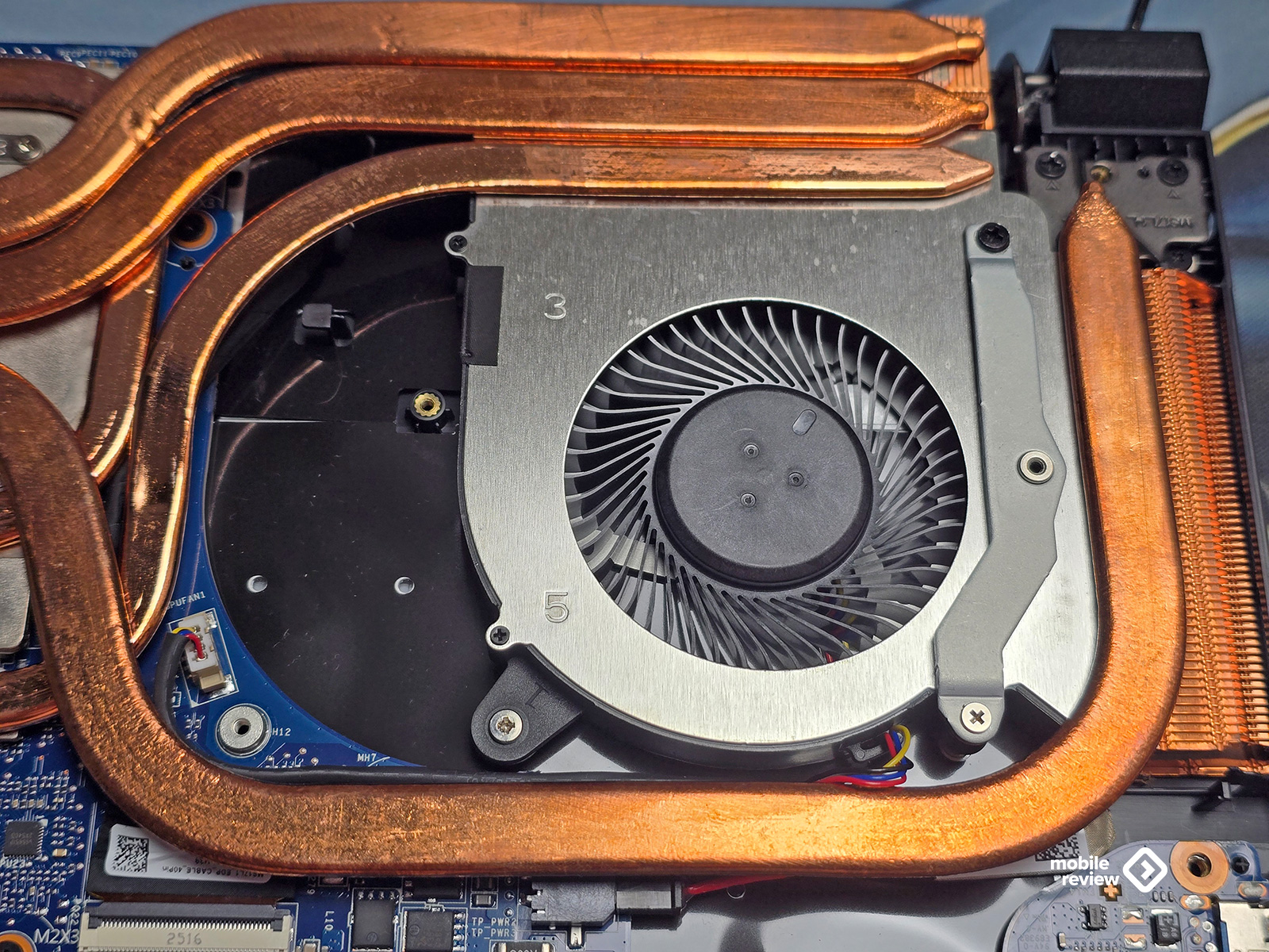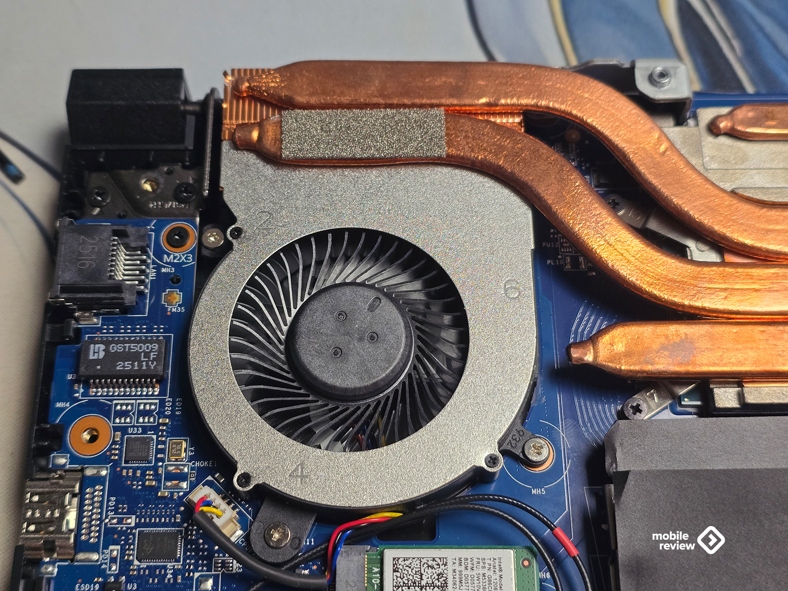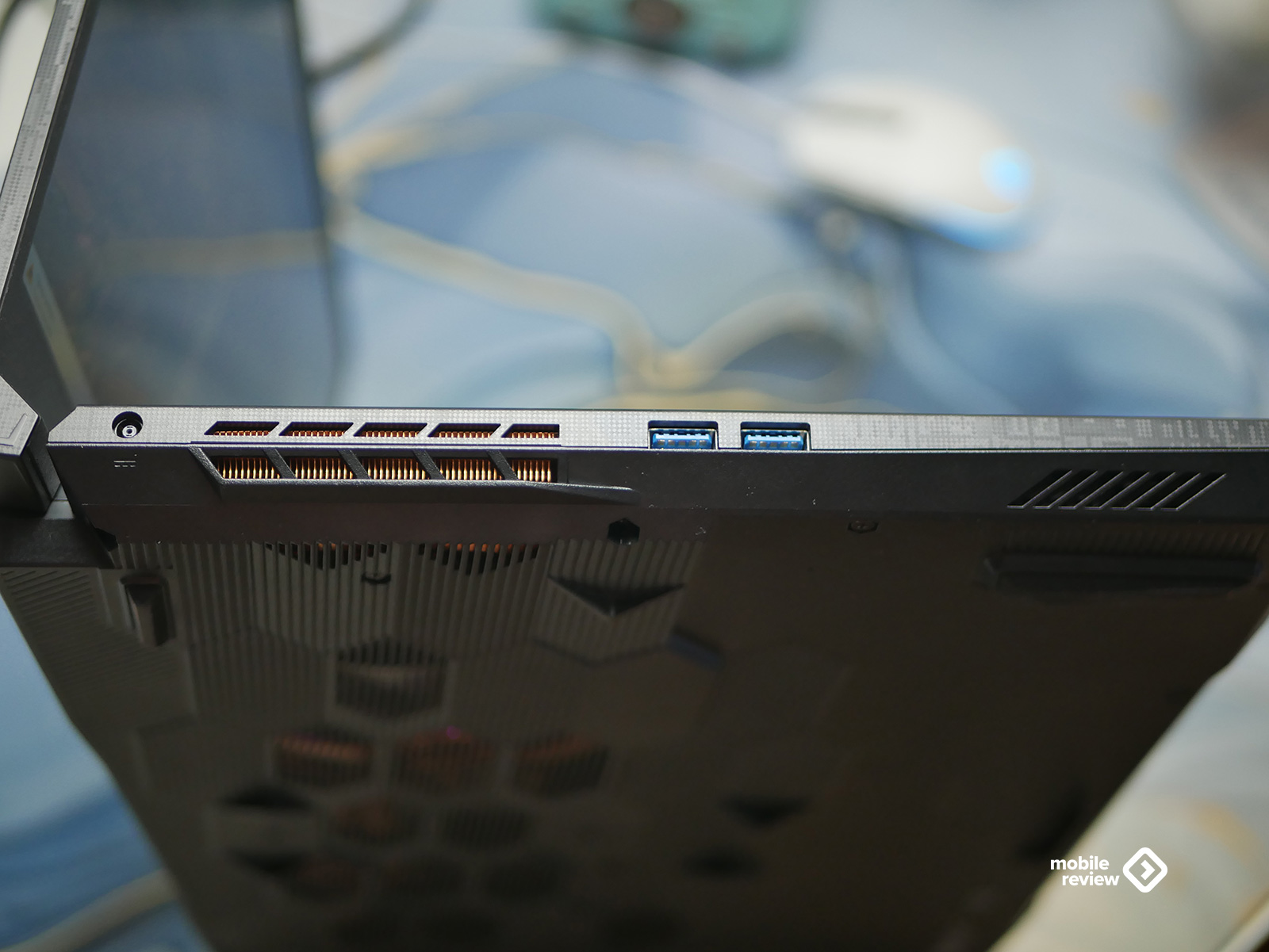 Снизу — целая панель с вентиляционными отверстиями в форме пятиугольников. Через них видно систему охлаждения: пять медных трубок и два вентилятора. Воздух забирается снизу и выдувается через три основные зоны — два отверстия сзади и одно сбоку. Забавно, но справа отверстия нет, все смещено влево. Видимо, инженеры так распределили воздушный поток, чтобы горячий воздух не мешал мышке или руке.