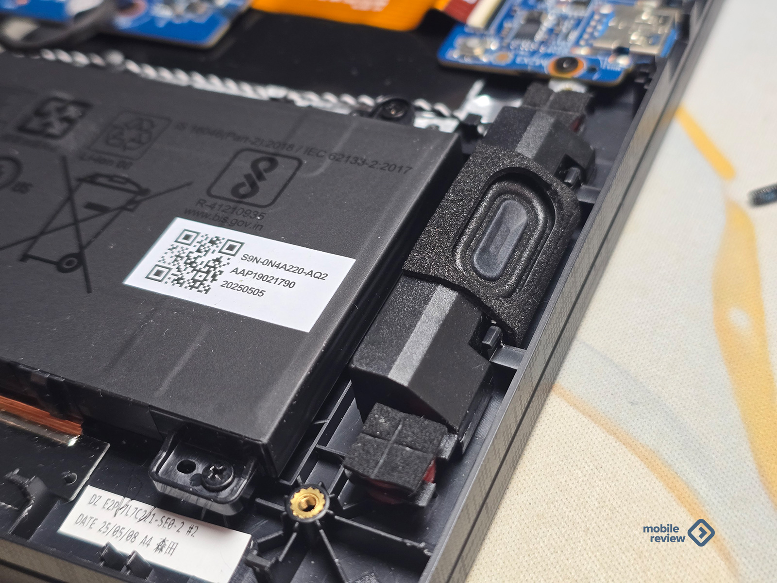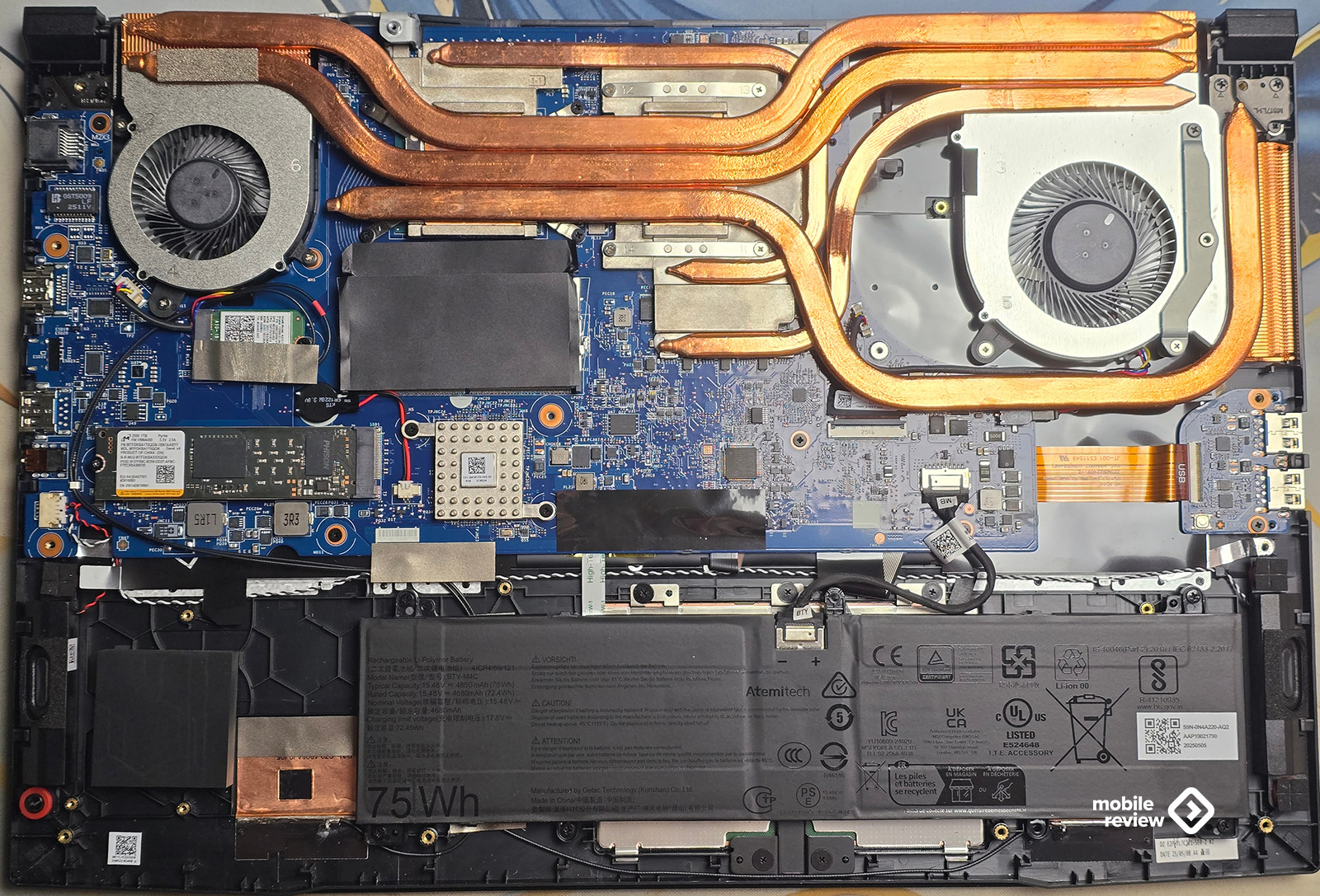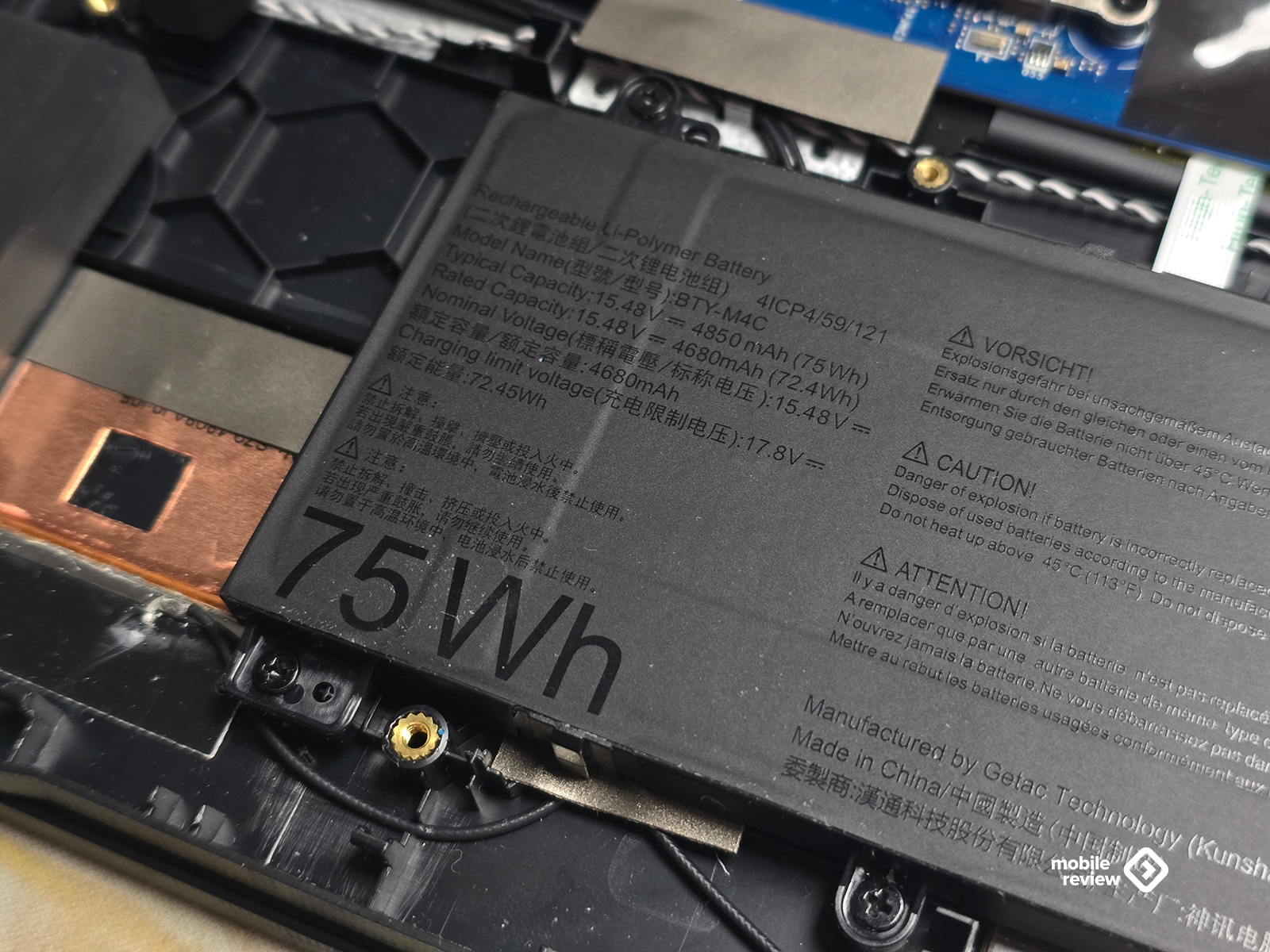 Внутри стоит литий-полимерный аккумулятор BTY-M4C на 4 ячейки (визуально как будто бы их 2), общей емкостью 75 Вт·ч (15.48 В, 4850 мАч). Если просто сидеть в браузере, смотреть видео или работать с документами, ноутбук протянет примерно 4–4,5 часа. В нетребовательных играх — около двух часов. А если запустить что-то серьезное вроде Cyberpunk 2077 или Alan Wake 2, то батарея сдастся примерно через час. И это, в общем-то, ожидаемо.