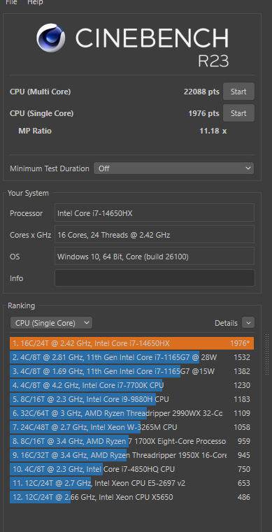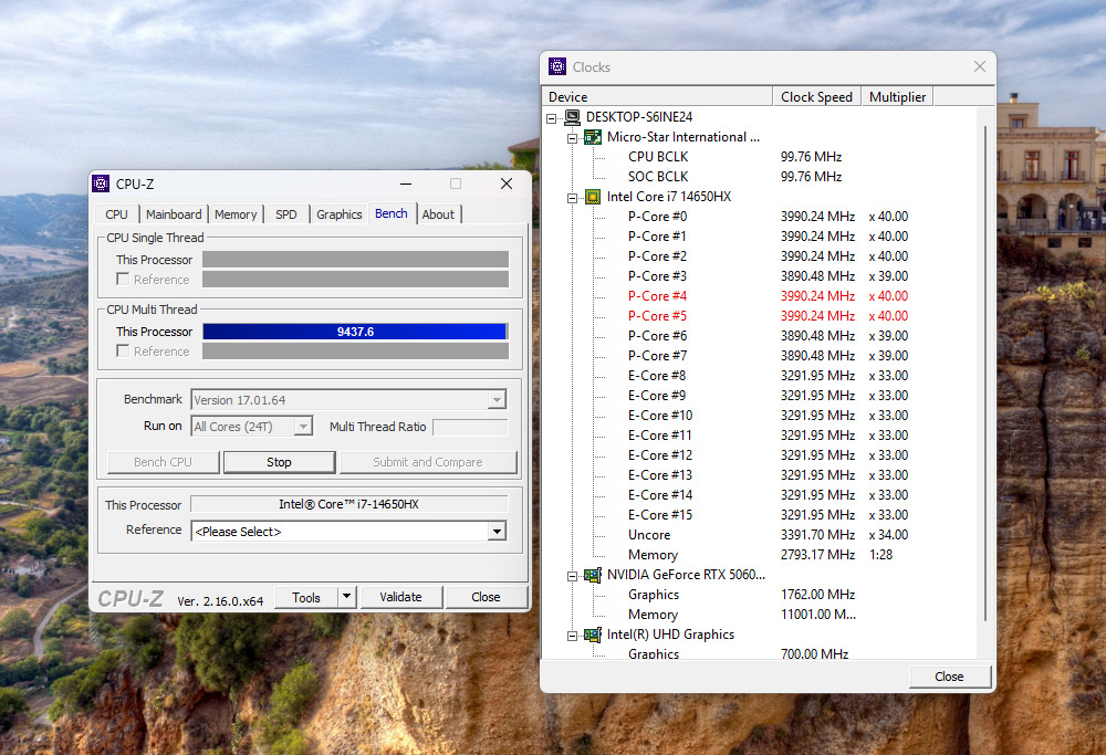 Линейка Katana 17 HX поставляется сразу с тремя вариантами процессоров: Intel Core i5-14450HX, i7-14650HX и i9-14900HX. У меня на тесте была «золотая середина» — Core i7-14650HX. Это мобильный чип из свежей серии Raptor Lake-HX Refresh, представленной в январе 2024 года. Процессор построен по техпроцессу Intel 7 (10-нм FinFET) и имеет гибридную архитектуру — 16 ядер, из которых восемь производительных (P) и восемь энергоэффективных (E), а также 24 потока. В обычном режиме P-ядра работают на частоте 2,2 ГГц, а в турбо-режиме могут разгоняться до 5,2 ГГц.