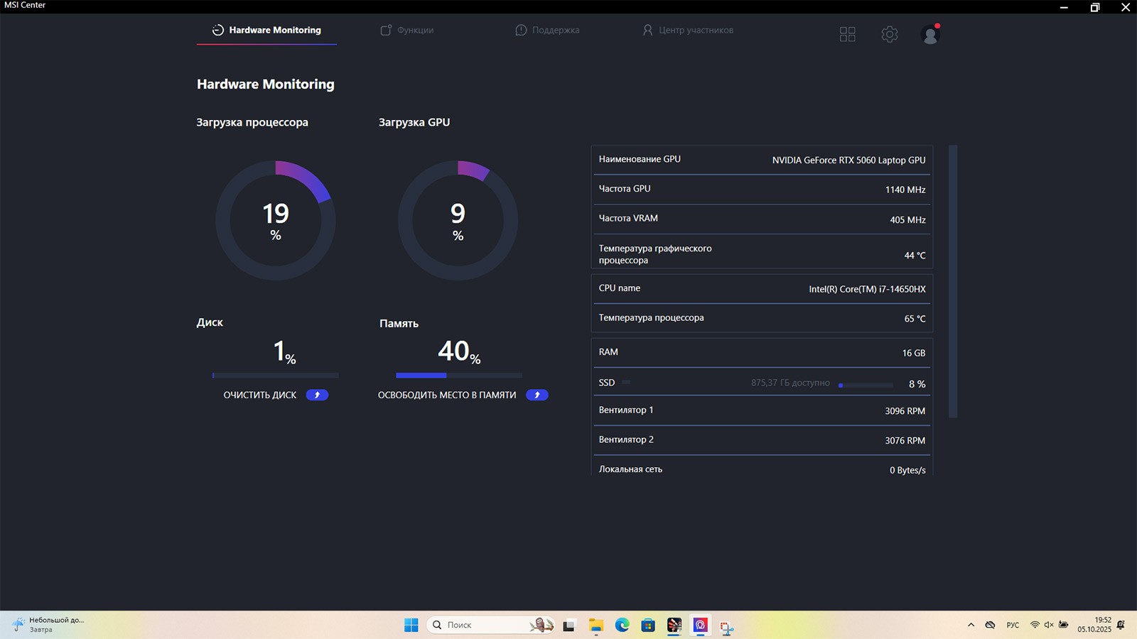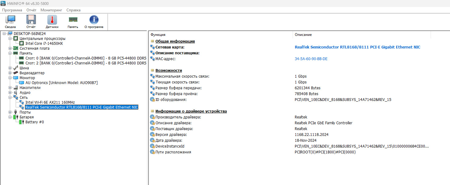 Мне досталась вторая версия — как раз с Core i7-14650HX и RTX 5060. Внутри установлен SSD на 1 ТБ, оперативная память представлена двумя планками по 8 ГБ (в сумме 16 ГБ), экран — 17,3 дюйма, 144 Гц.