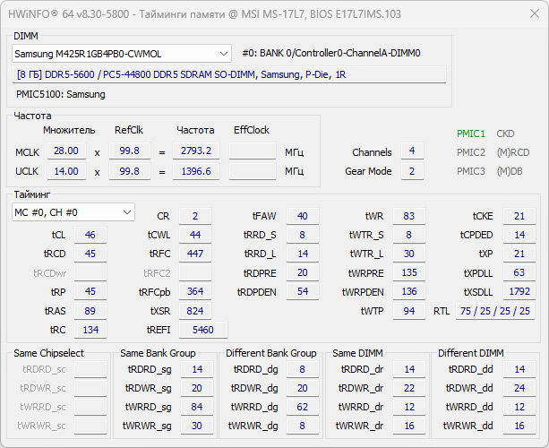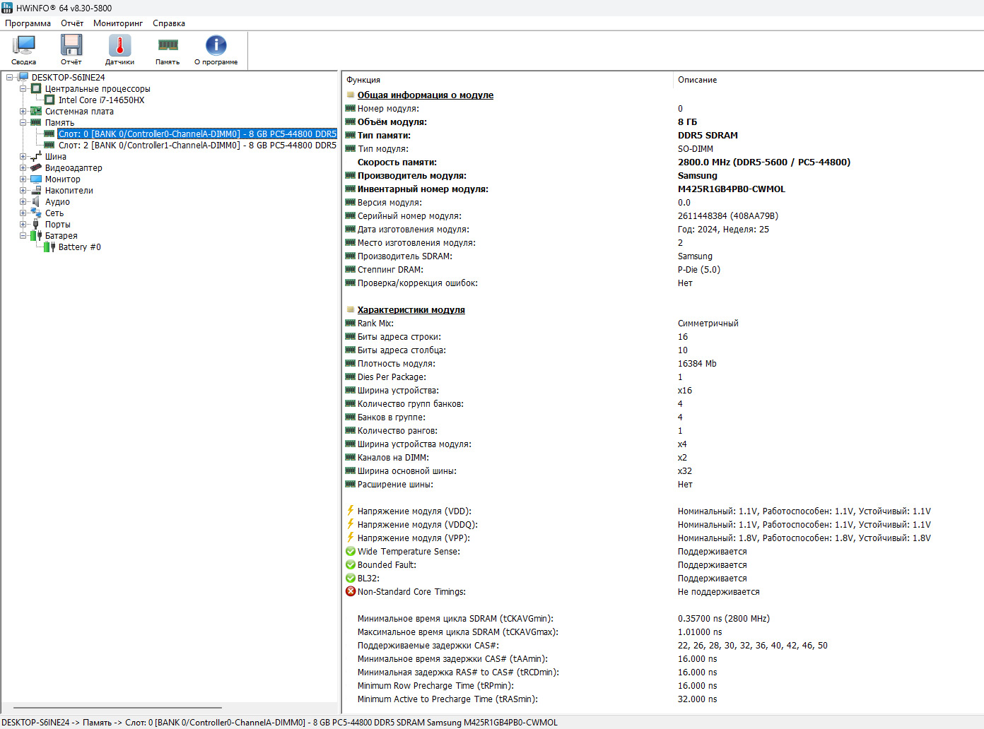 В ноутбуке установлено два слота под оперативную память, и оба они заняты модулями по 8 ГБ. Используются планки производства Samsung (модель M425R1GB4PB0-CWMOL) — это DDR5-5600 (PC5-44800), современный и быстрый тип памяти.