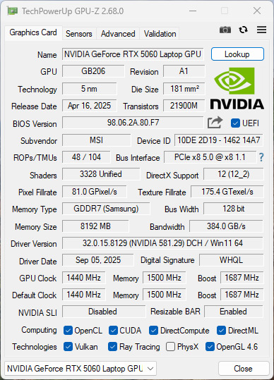 NVIDIA GeForce RTX 5060 для ноутбуков была анонсирована в 2025 году и представляет собой графический ускоритель нового поколения, созданный на архитектуре Blackwell 2.0 по 5-нм техпроцессу. Видеокарта оснащена 8 ГБ быстрой памяти GDDR7.