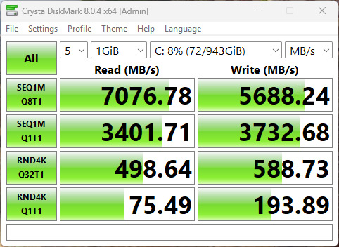 Это очень быстрый накопитель, обеспечивающий скорости до 7000 МБ/с при чтении и около 5700 МБ/с при записи. Такие показатели позволяют системе мгновенно загружаться, а большим играм — стартовать буквально за секунды.