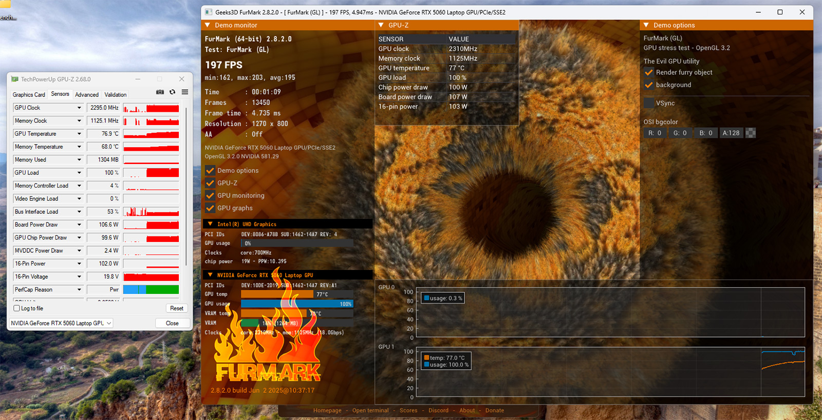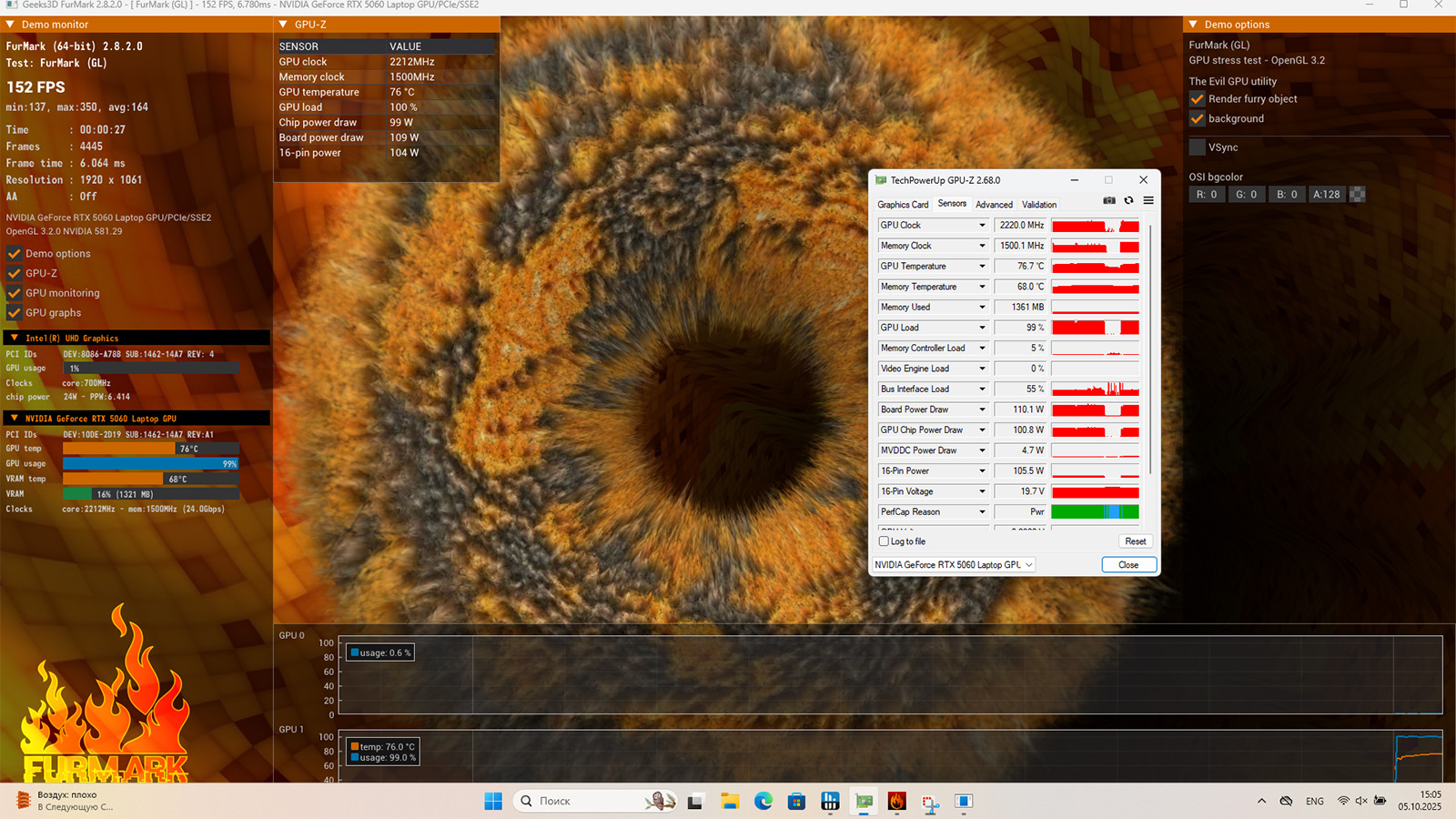 Что касается шума, то, думаю, здесь все предсказуемо. Процессор горячий, поэтому система охлаждения работает активно. Под серьезной нагрузкой вентиляторы выдают довольно заметный гул — не рев самолета, конечно, но если сидеть в тишине, шум ощутимый. В простое все спокойно: слышно только легкое шуршание кулеров. Имхо, это нормальная цена за производительность такого уровня.