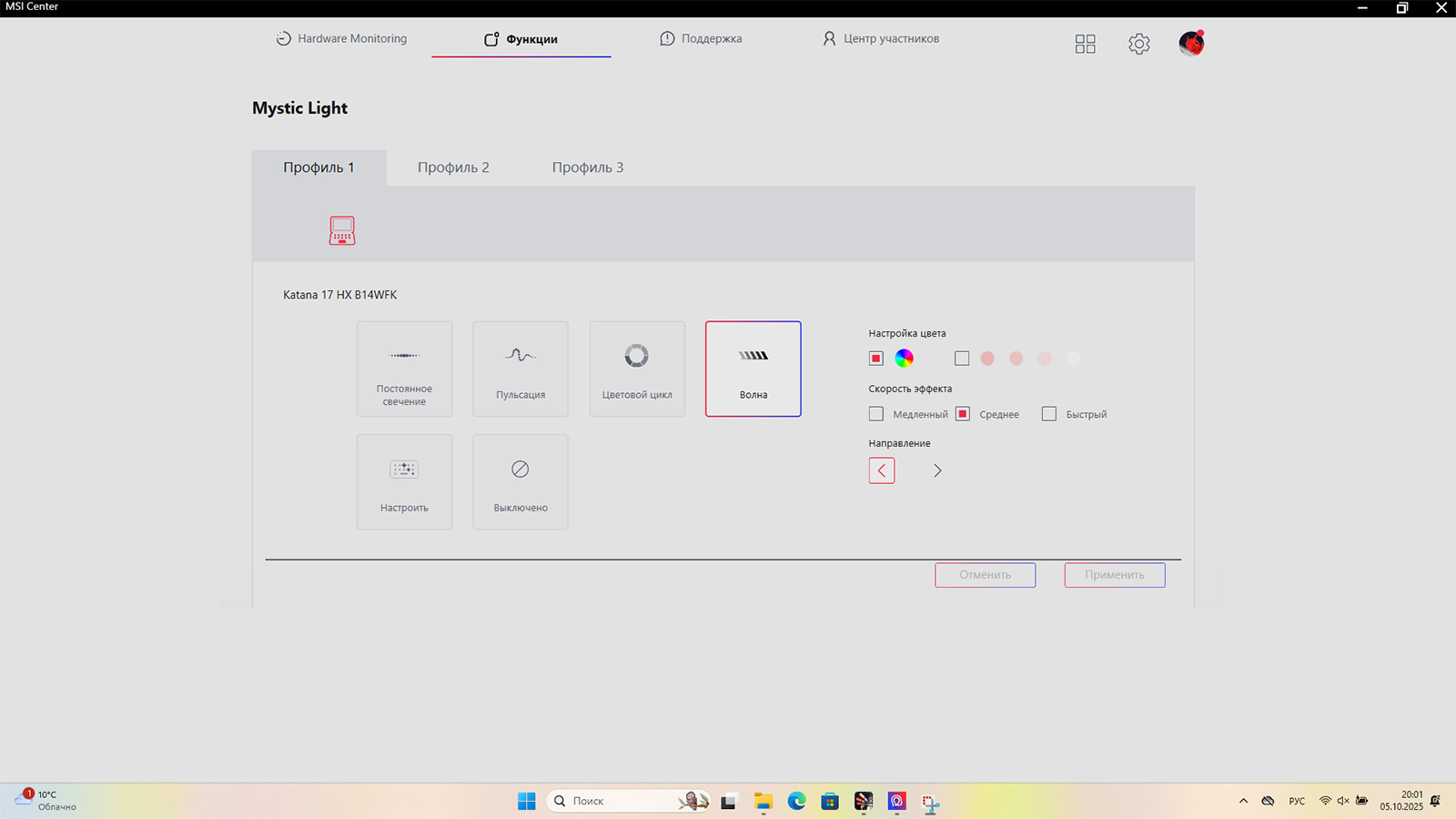 Подсветка настраивается через фирменное приложение MSI Center. Чтобы изменить цвета или эффекты, нужно установить модуль Mystic Light. Там можно выбрать тип подсветки, скорость, интенсивность и, самое главное, цвет для каждой из четырех зон отдельно. Я, например, оставил классический белый — без миганий и переливов, просто, спокойно и стильно. Но при желании можно включить любые эффекты — от плавных переходов до пульсации.