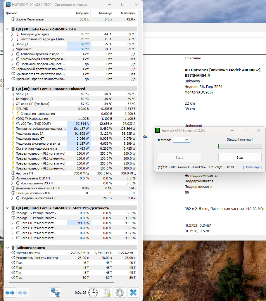 В моих тестах Core i7-14650HX нагревался максимум до 90 градусов — да, горячий, но при этом работал стабильно, без троттлинга и падения частот. Средний уровень энергопотребления под нагрузкой — около 100 Вт. Это вполне ожидаемо для такого класса устройств.