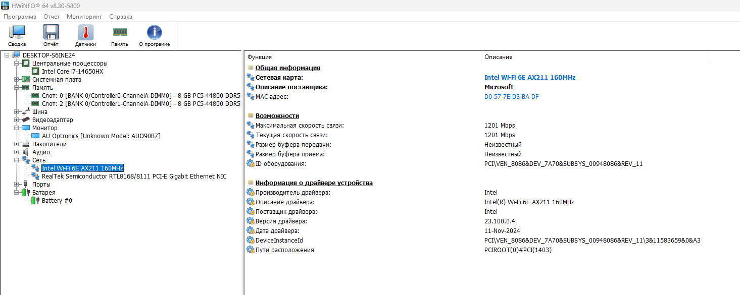 За беспроводное соединение в MSI Katana 17 отвечает Intel AX211 Wi-Fi 6E. Поддерживаются оба диапазона, стандарт AX и Bluetooth 5.3.