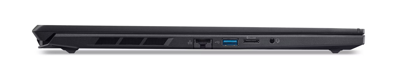 Если смотреть на ноутбук слева: вентиляционное отверстие для выхода горячего воздуха, разъем Ethernet (тот самый RJ-45, которого уже почти не встретишь в тонких моделях), USB-A 3.2 Gen 1, слот для microSD-карты и комбинированный 3,5 мм разъем для наушников или гарнитуры.