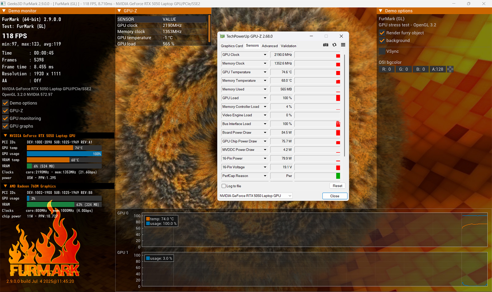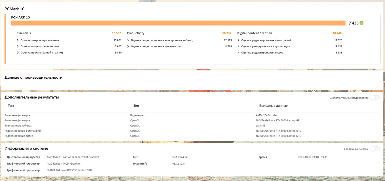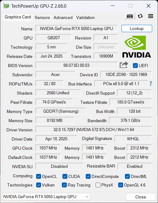 В моем случае ноутбук был оснащен RTX 5050. Это, скажем так, базовый уровень игровой составляющей. У карты 2560 ядер CUDA и 8 ГБ видеопамяти GDDR7. В реальных играх она примерно на 15-20% слабее RTX 5060.