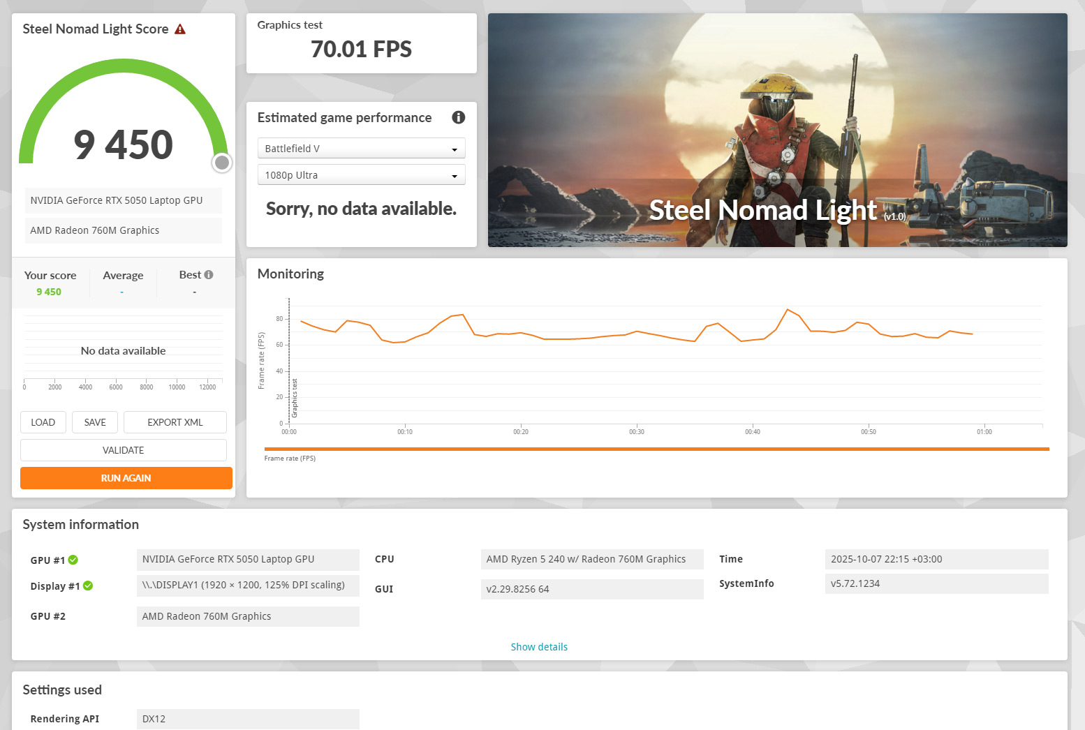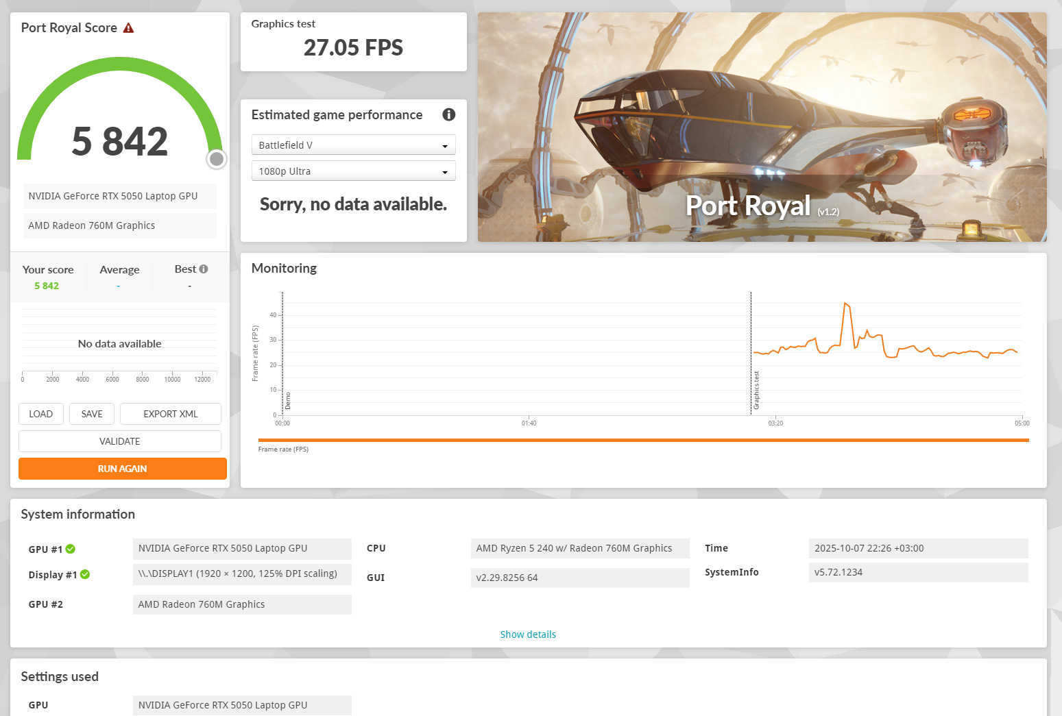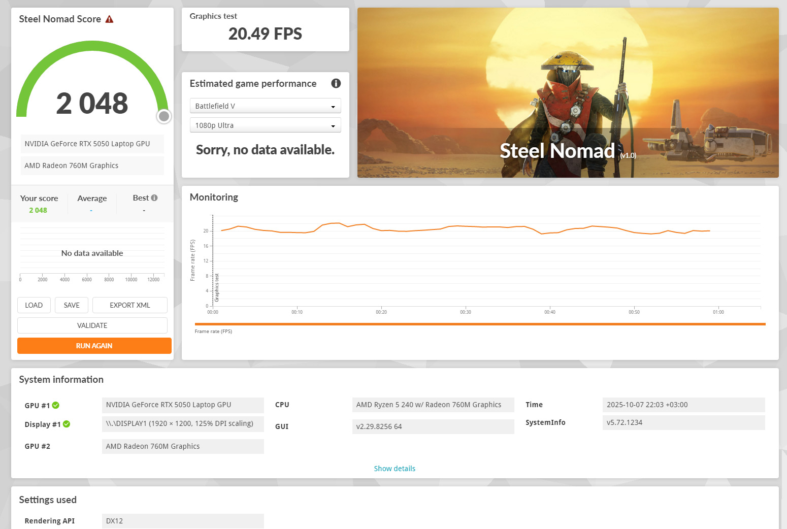В моем случае ноутбук был оснащен RTX 5050. Это, скажем так, базовый уровень игровой составляющей. У карты 2560 ядер CUDA и 8 ГБ видеопамяти GDDR7. В реальных играх она примерно на 15-20% слабее RTX 5060.