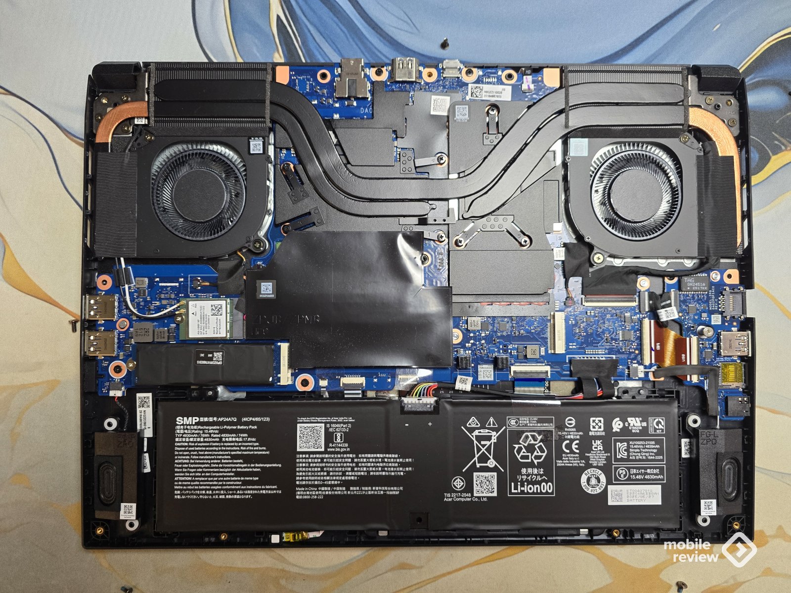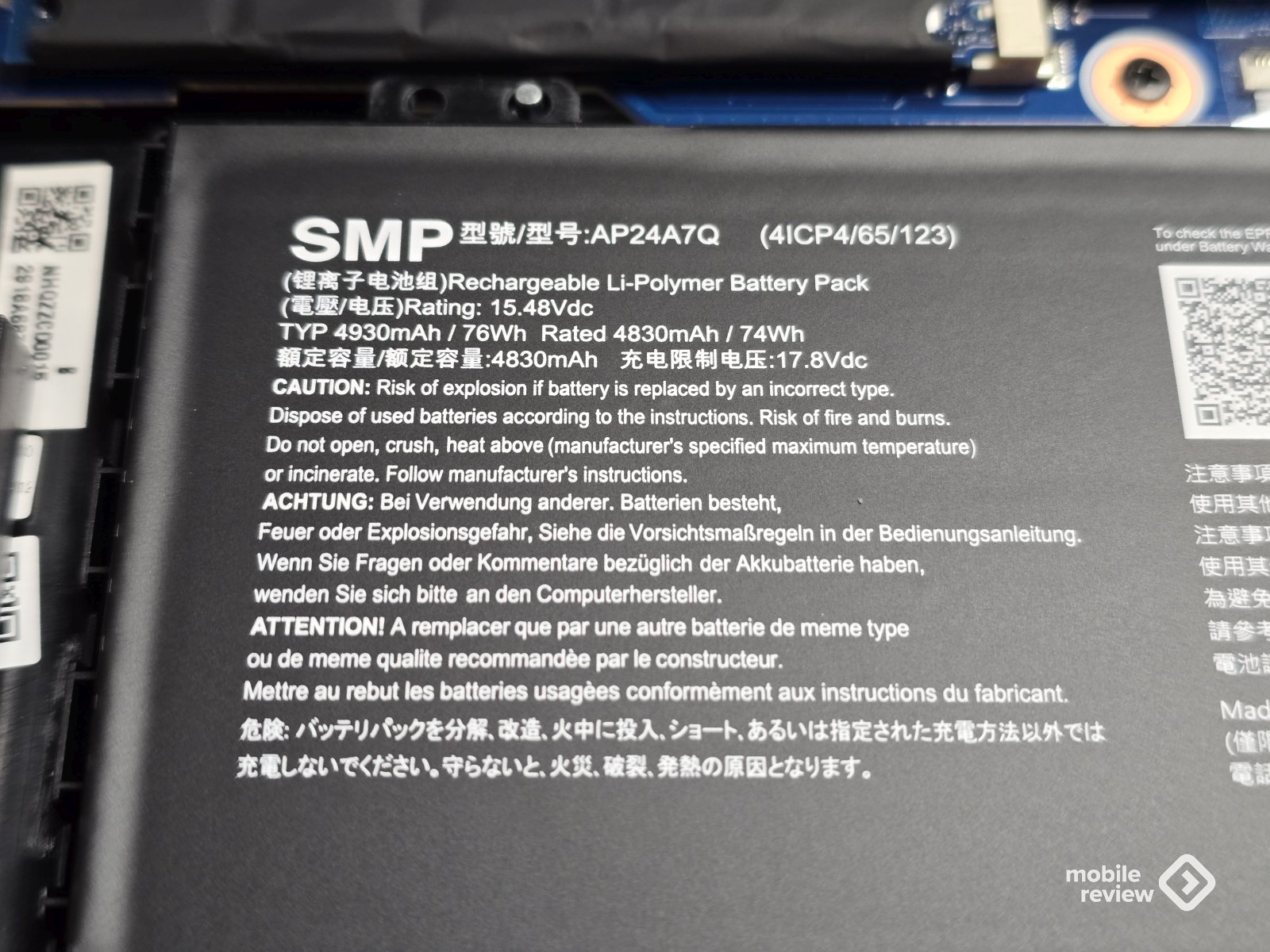 С автономностью у Acer Nitro V 16S все оказалось лучше, чем я ожидал. Обычно игровые ноутбуки живут от батареи как спринтер на стометровке — быстро и недолго. Тут установлен аккумулятор AP24A7Q емкостью 76 Вт·ч (4930 мА·ч) — вроде бы стандартный объем для этого класса, ничего сверхъестественного. Но, как говорится, дьявол кроется в деталях.