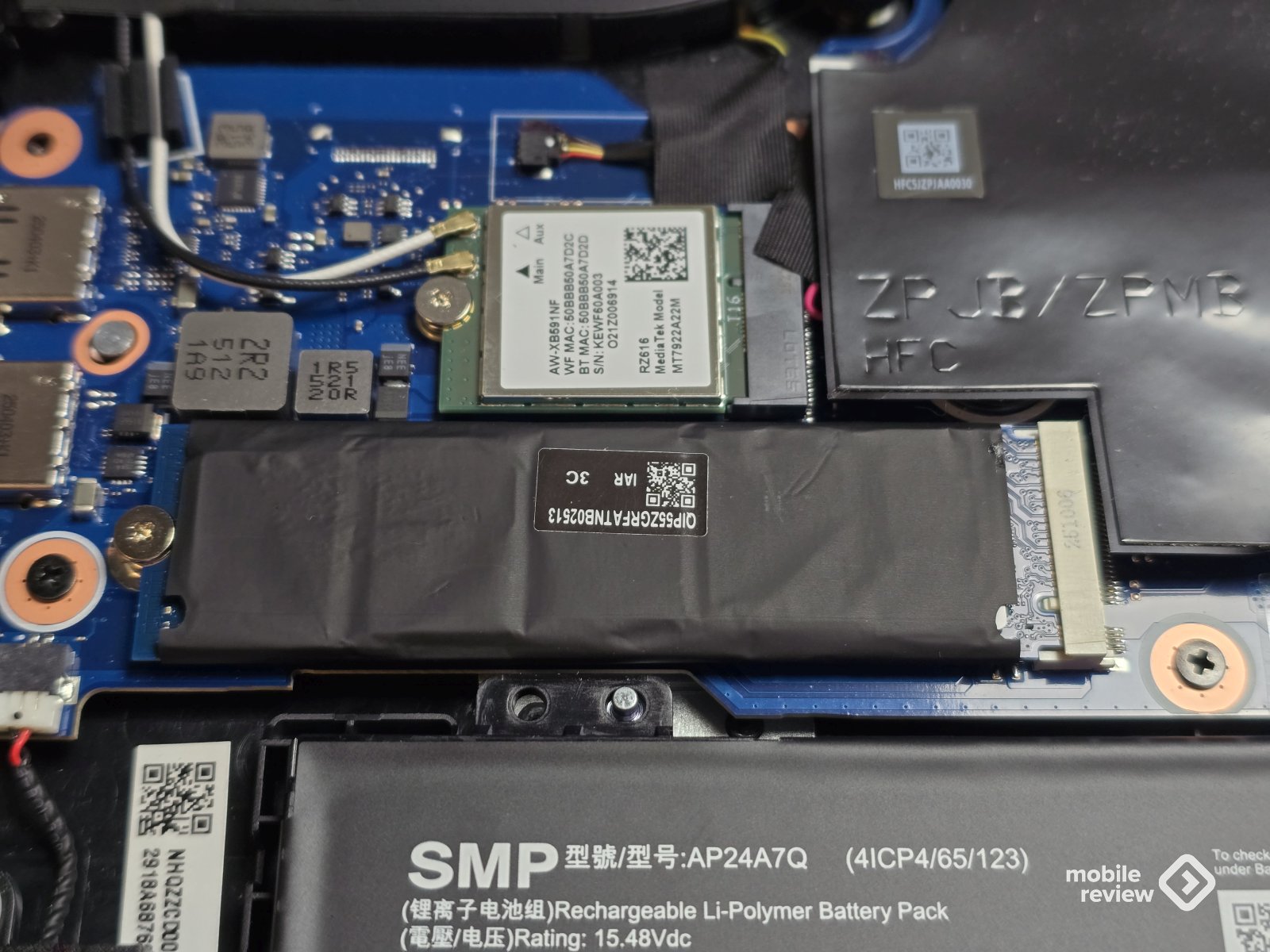 Внутри все логично расположено. Есть два слота под SSD: один слева, другой справа на материнской плате. Над левым слотом находится беспроводной модуль. В центре корпуса — два слота под оперативную память, но в моем ноутбуке был задействован только один. Честно говоря, странно, могли бы сразу поставить две планки по 8 ГБ и получить двухканальный режим, это дало бы ощутимый прирост производительности.