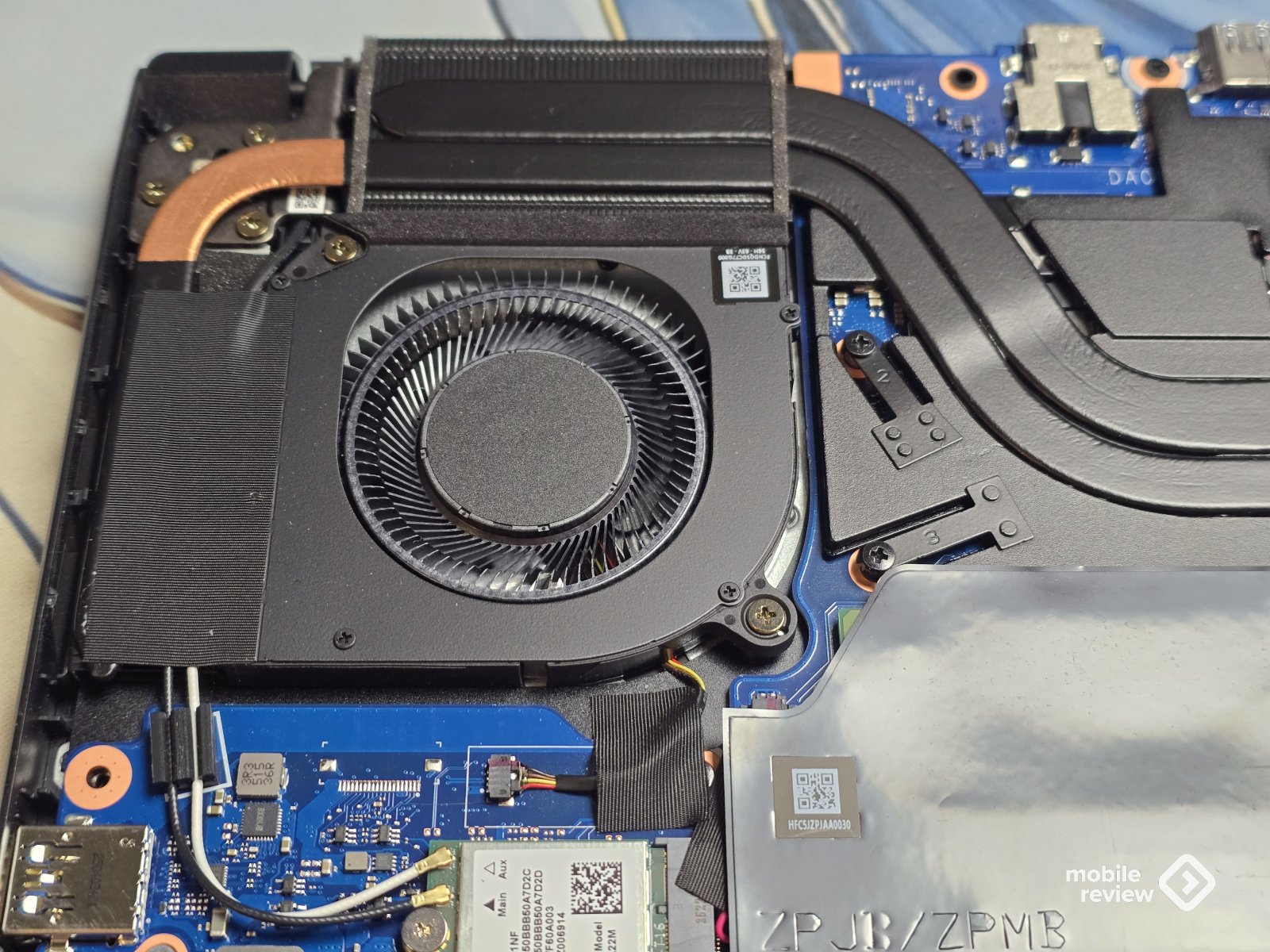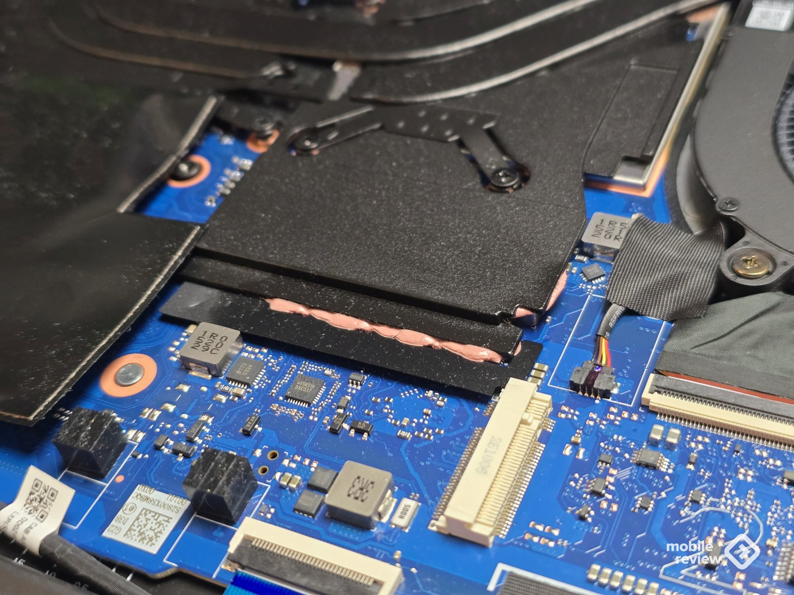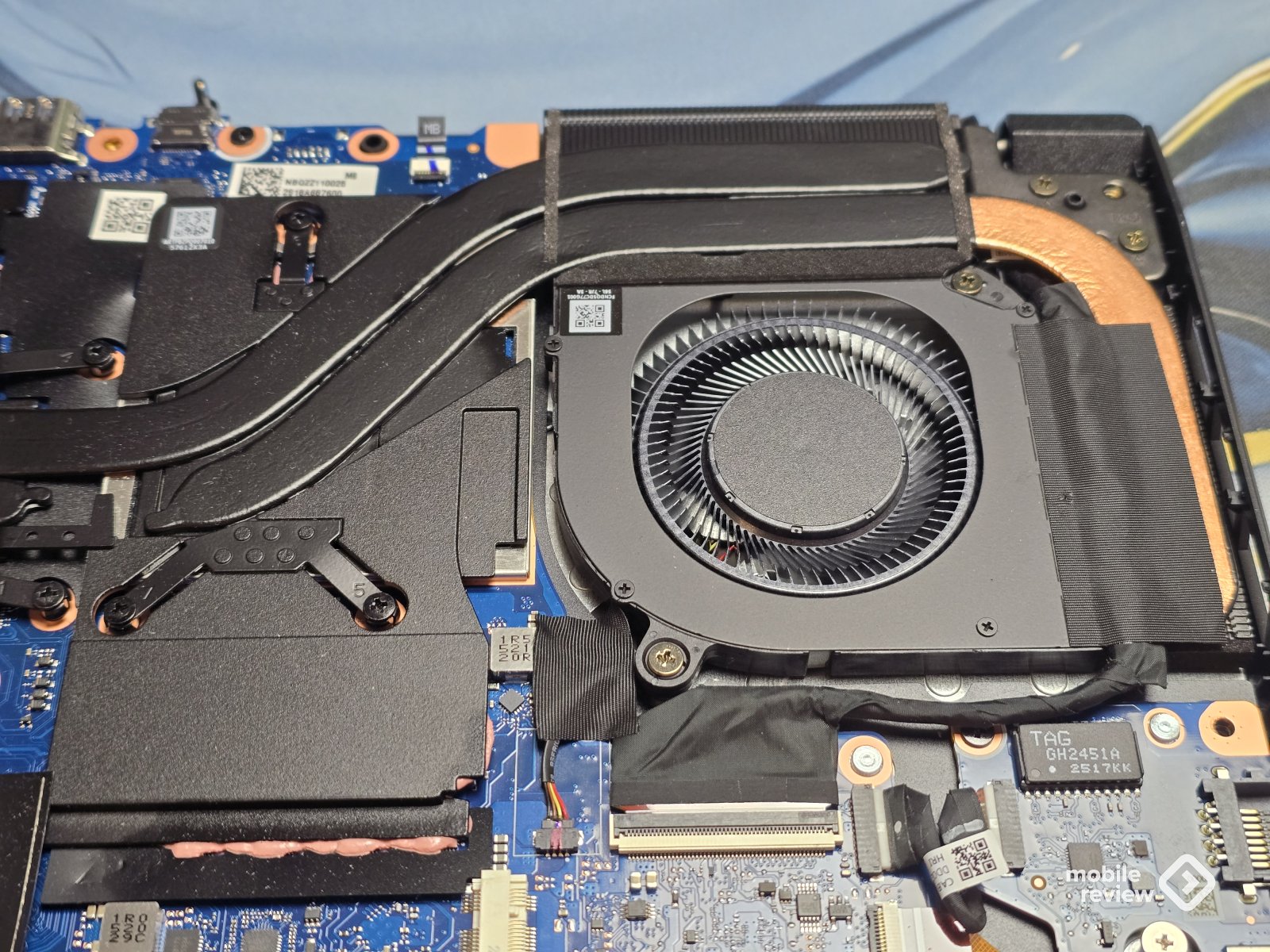 Система охлаждения продумана под реальные нагрузки процессора и видеокарты. Две медные трубки охлаждают CPU, еще две — GPU. Два одинаковых кулера обеспечивают хороший поток воздуха. Зона VRM тоже защищена радиатором с теплопроводящей пастой розового цвета. Мне кажется, инженеры сделали все аккуратно и функционально — без лишнего пафоса, но с умом.