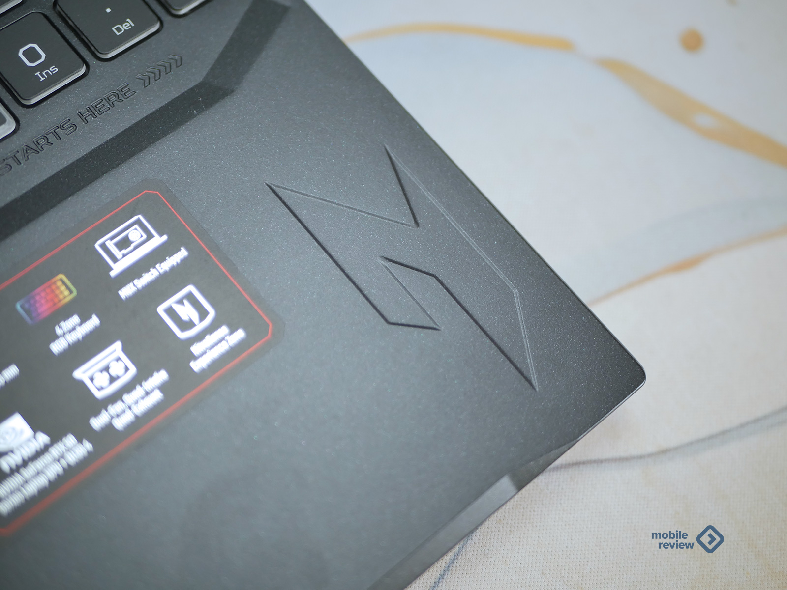 Внешне ноутбук получился в меру строгим и в меру геймерским. Думаю, Acer осознанно пошла по пути минимализма: никаких кислотных вставок, RGB-полосок и прочих кричащих элементов. Только аккуратные акценты, которые намекают на характер устройства. На верхней крышке — тиснение в виде буквы N, которая приятно переливается на свету, но не подсвечивается. Смотрится стильно и сдержанно.