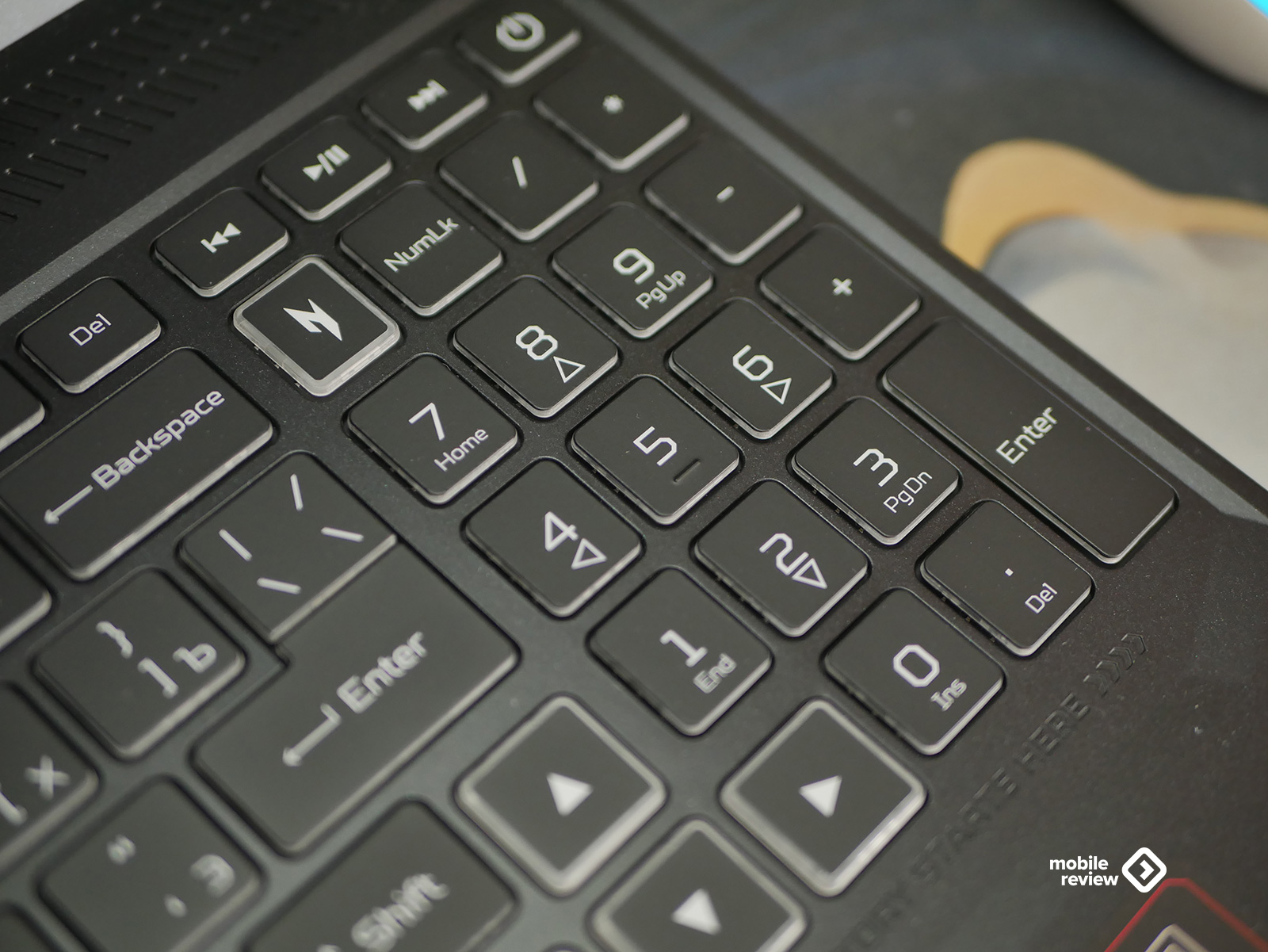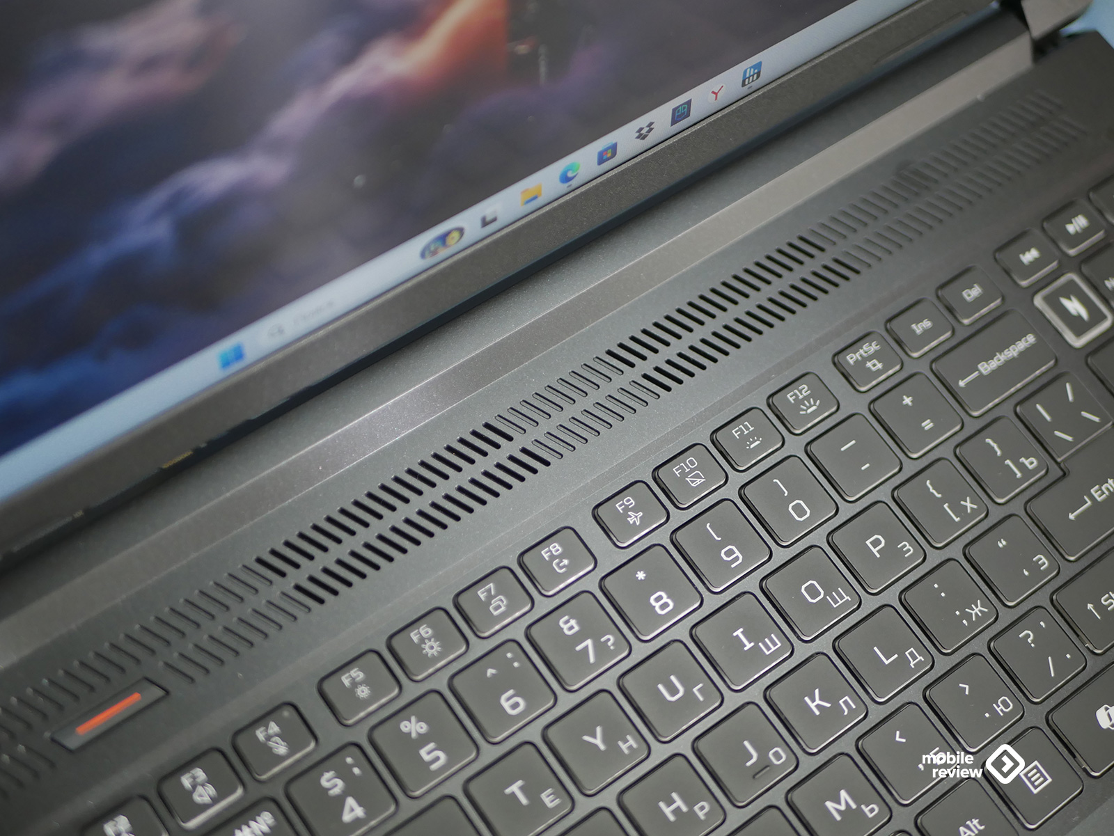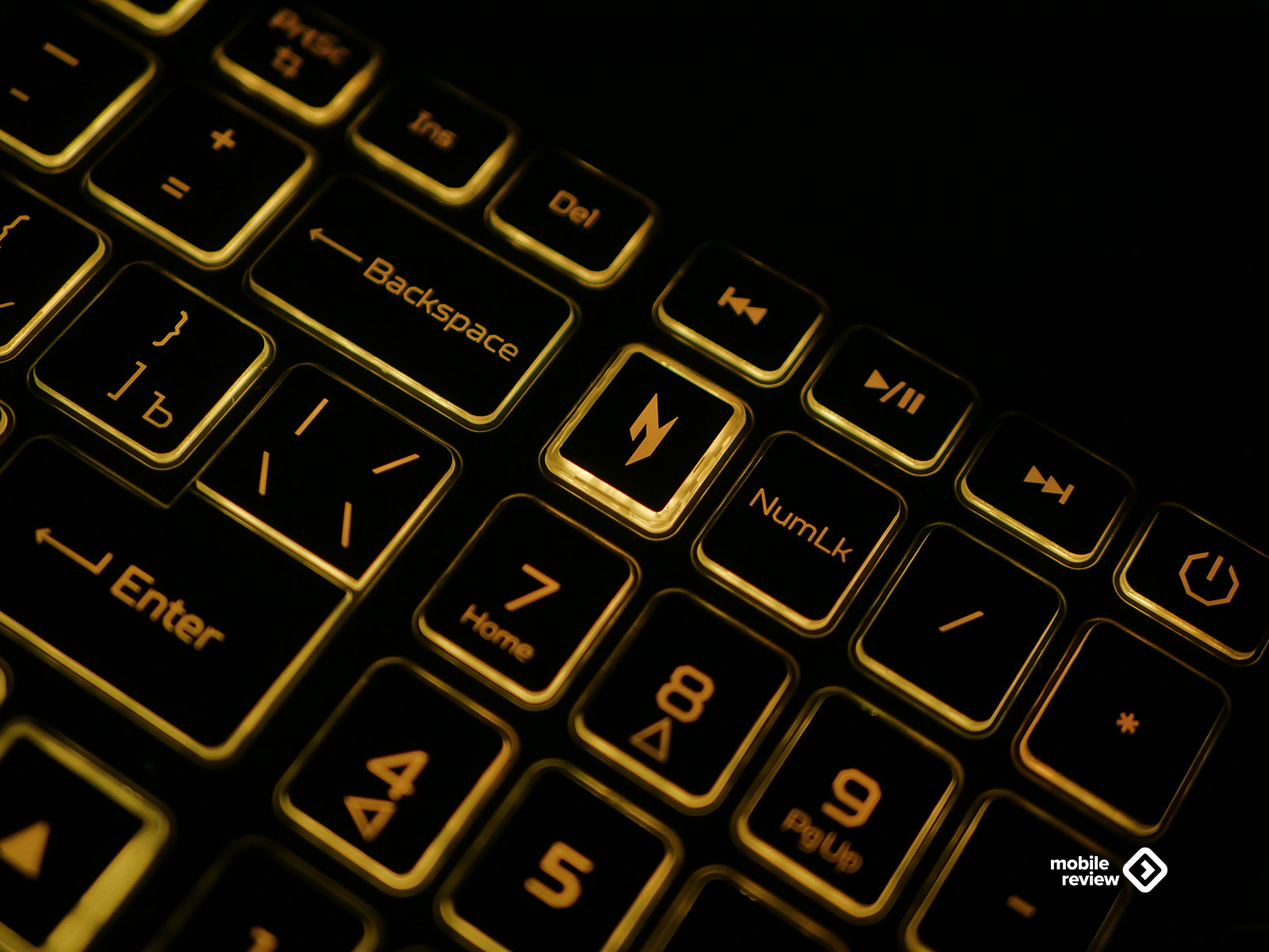 Над клавиатурой с левой стороны расположена длинная кнопка, отвечающая за переключение режима работы ноутбука. Кнопка питания, наоборот, справа — и, на мой взгляд, это удобно: не заденешь случайно в пылу сражения. Отдельная «уважуха» за выделенную клавишу NitroSense.