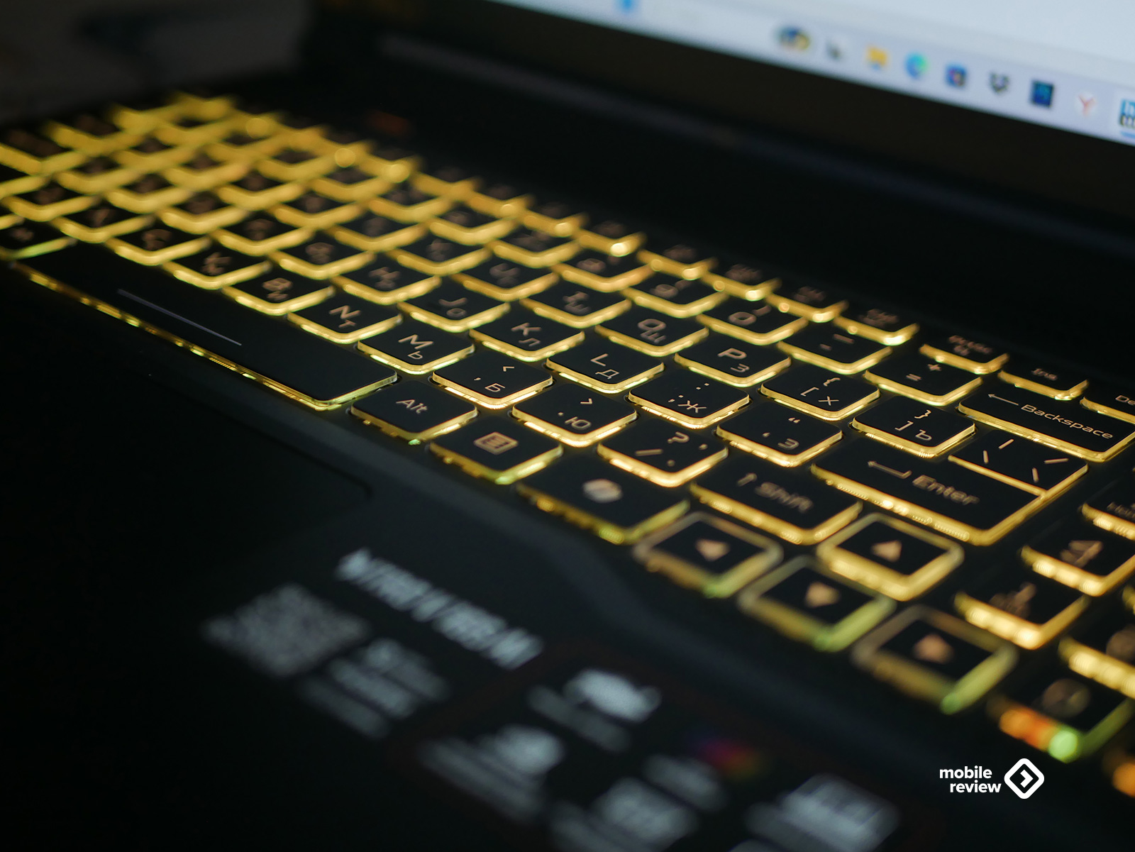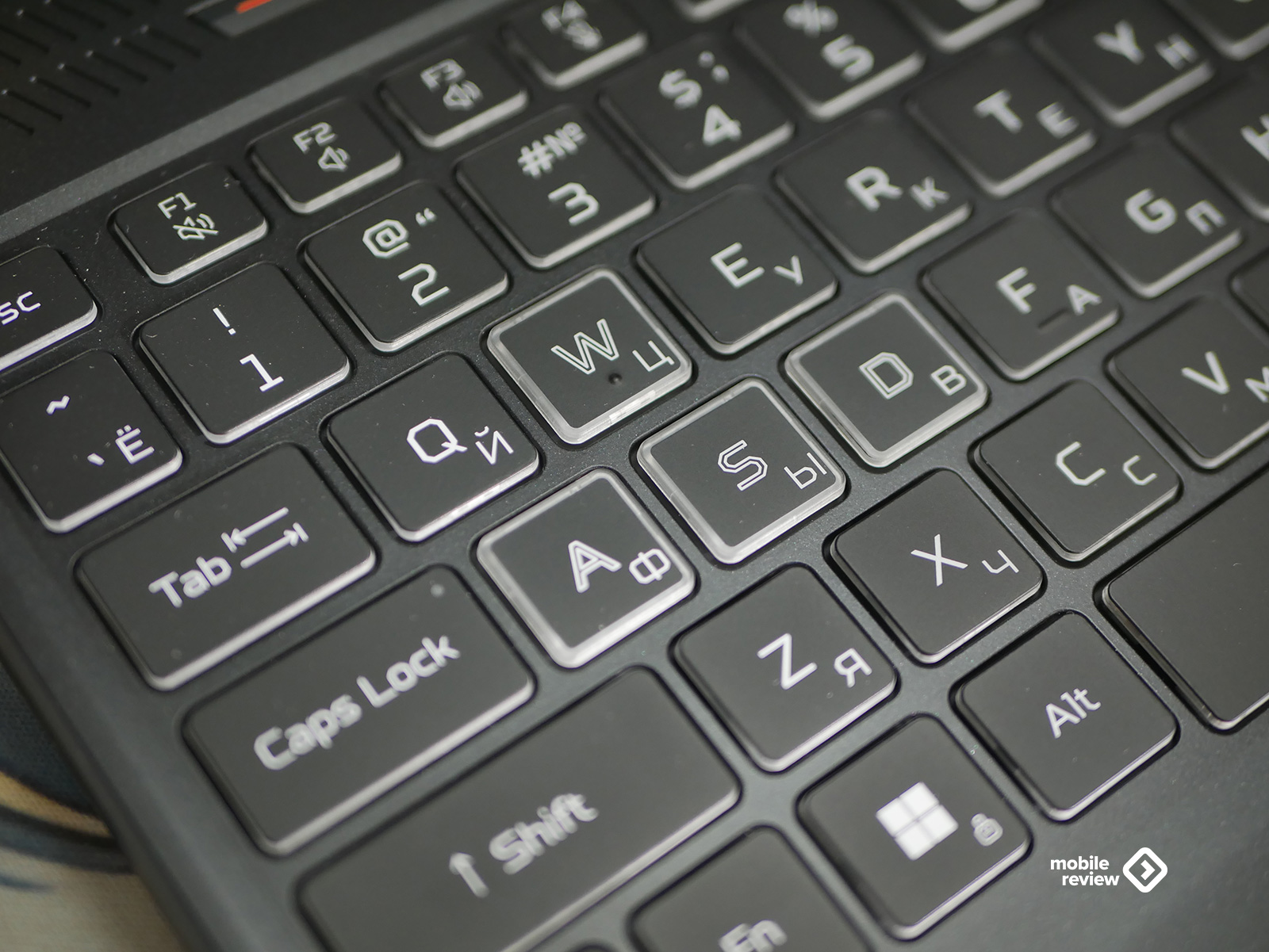 Клавиатура здесь полноразмерная и довольно крупная. Нанесены обе раскладки — и кириллица, и латиница. Причем буквы полупрозрачные, так что сквозь них красиво пробивается подсветка. Кстати, любимые геймерами кнопки WASD выделены белым контуром и двойной обводкой.