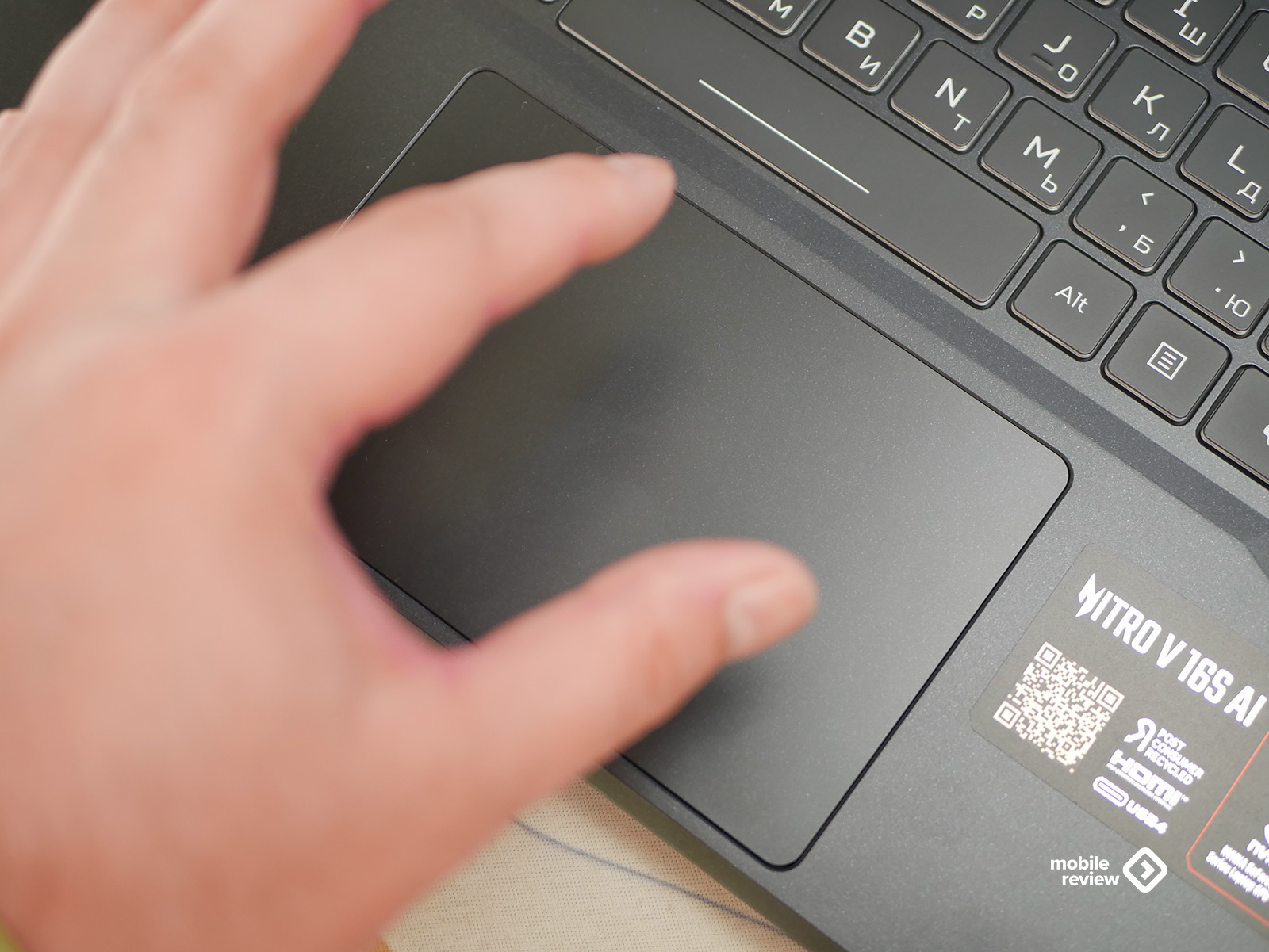 Теперь про тачпад. Он аккуратный, 125 на 82 мм, чуть смещен влево от центра, утоплен в корпус и обрамлен симпатичной фаской. Я люблю такие детали — они вроде бы незначительные, но именно из них складывается общее ощущение «классной сборки». Поверхность напоминает стекло: палец скользит легко, нажатия четкие и почти бесшумные. Люфта нет, управление жестами работает без нареканий.