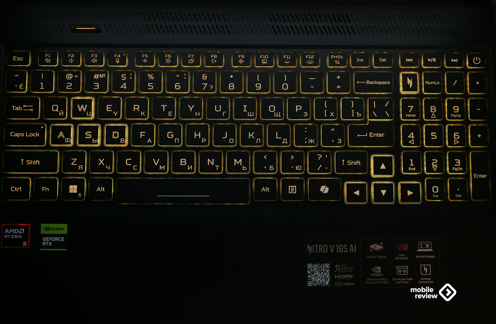 Есть, однако, один интересный нюанс, который многие даже не замечают. Если после слова Nitro идет буква V — это значит, что перед вами классическая версия в традиционном корпусе и с максимально возможной видеокартой в линейке, например RTX 5070. А вот если этой буквы нет, то, скорее всего, речь идет о модели с чуть другим дизайном корпуса и даже подсвечивающимся логотипом на крышке. Такие ноутбуки чаще встречаются за границей, потому что в России официально продаются именно версии с буквой V.