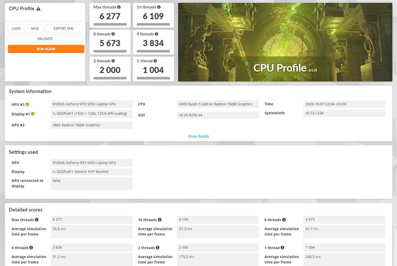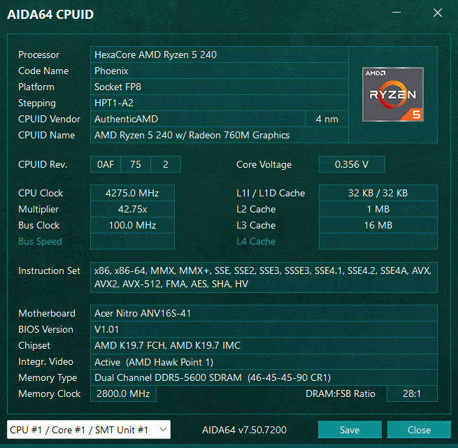 Процессор в моем экземпляре Acer Nitro V 16S — это AMD Ryzen 5 240. Сам по себе он не флагман, но и назвать его «слабым звеном» язык не поворачивается. Модель свежая, представлена в январе этого года, построена на архитектуре Zen 4 и выполнена по 4-нм техпроцессу. Внутри 6 ядер и 12 потоков, базовая частота — 4,3 ГГц, а в пике процессор может подниматься почти до 5 ГГц.