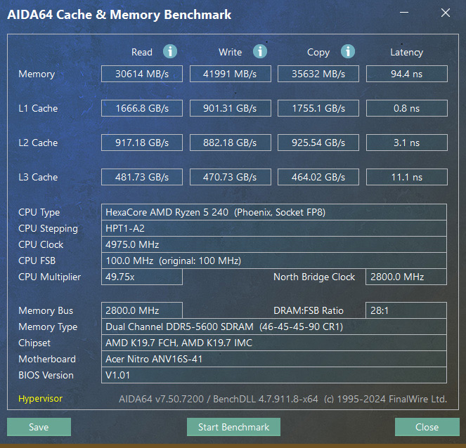 AMD удалось сделать очень удачный чип. Ryzen 5 240 получился универсальным — тихим, экономичным и при этом вполне бодрым. Для повседневных задач его хватает с головой, а в играх он не станет «бутылочным горлышком». Думаю, именно поэтому Acer выбрали его для базовой конфигурации Nitro V 16S.