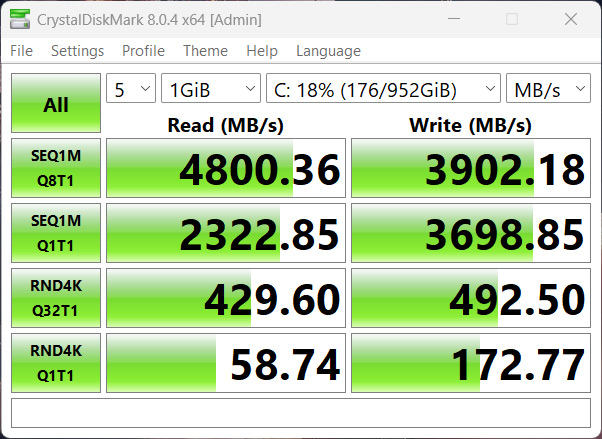 В моем ноутбуке установлен SSD Kingston на 1 ТБ, PCIe 4.0 x4 NVMe. Судя по тестам, он работает на максимально возможной скорости для данной модели — около 4800 МБ/с на чтение и 3900 МБ/с на запись. Я думаю, этого хватит с запасом для любых задач — от работы с документами до больших игровых библиотек и видео.