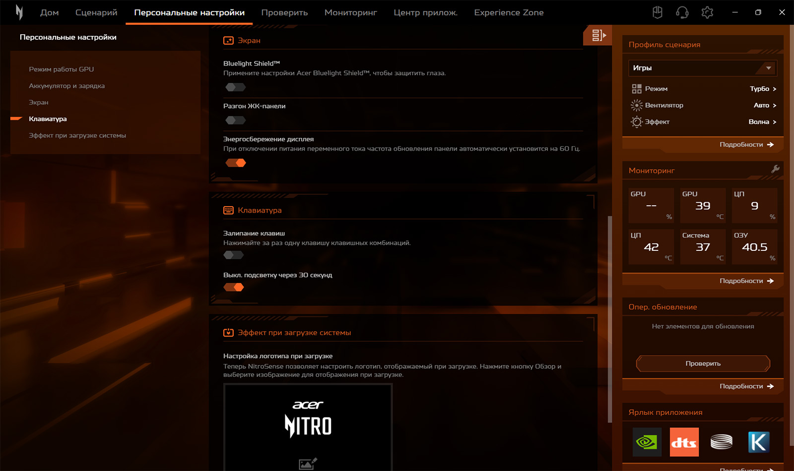 Глаза здесь, кстати, уставать не будут: ШИМ-мерцания нет вообще. Есть даже фирменная технология Acer Bluelight Shield, которая снижает интенсивность синего свечения. Все это настраивается в приложении NitroSense.