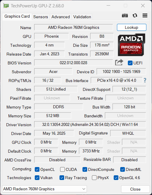 Интересный момент — наличие встроенной графики Radeon 760M. Это означает, что ноутбук умеет автоматически переключаться между ней и дискретной видеокартой (в моем случае RTX 5050), в зависимости от того, что вы делаете. Если вы просто работаете или смотрите видео — активна встроенная графика. Если запускаете игру — включается дискретная. Можно и вручную выбрать режим, если хочется все держать под контролем.