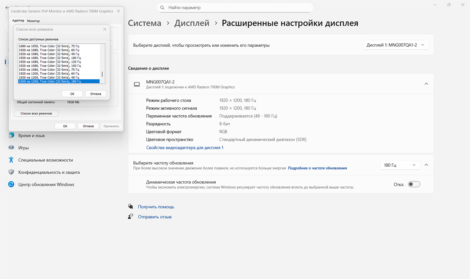 Частота обновления до 180 Гц — и вот это уже прямо подарок для геймеров. Честно скажу: поначалу у меня стояло 60 Гц, и я все никак не мог понять, почему картинка будто бы немного «тормозит». Потом вспомнил, что мой монитор дома на 120 Гц, переключил ноутбук на 180 — и все, плавность вернулась. Для обычной офисной рутины такая частота, конечно, с запасом, а вот для игр — самое то.
