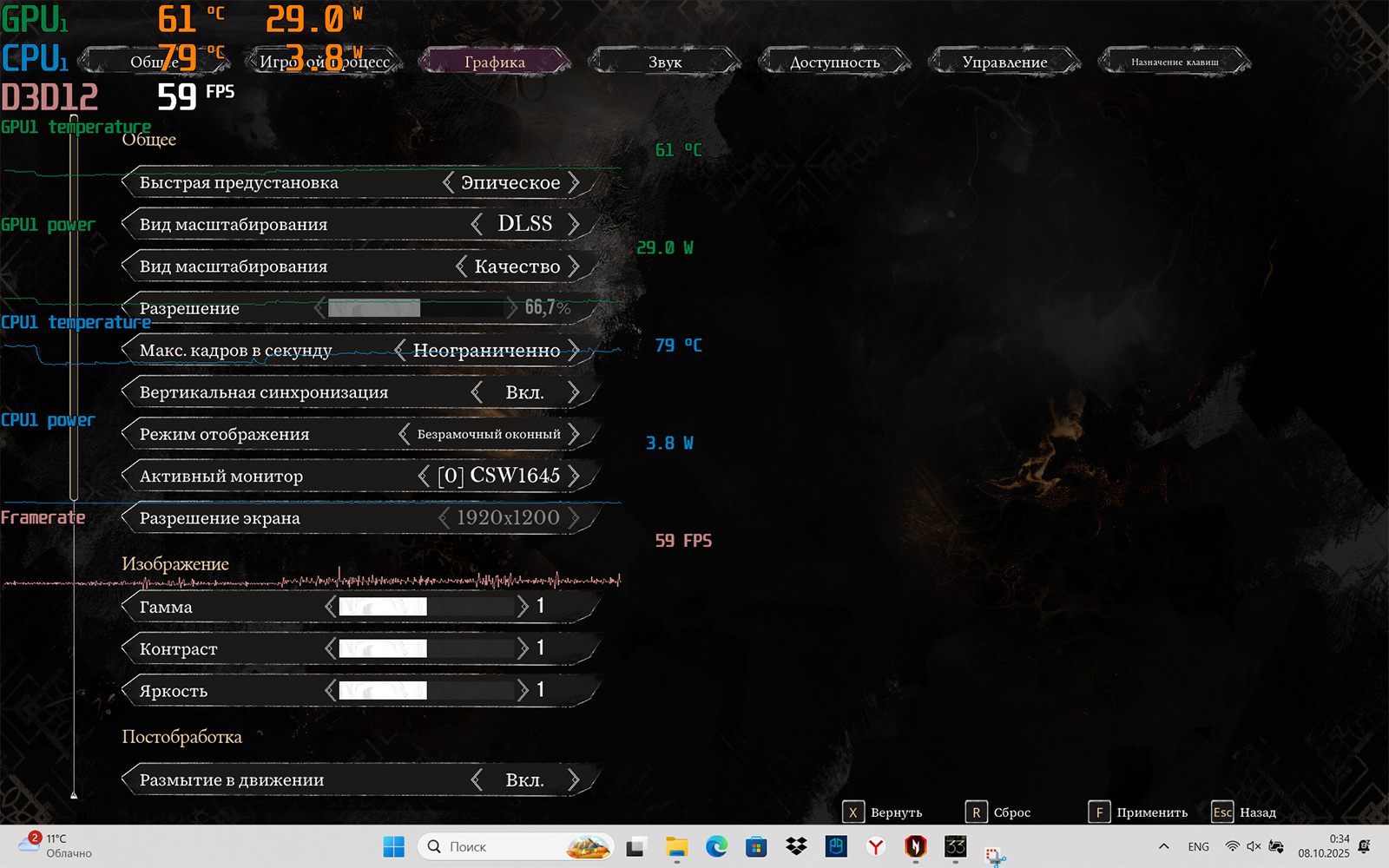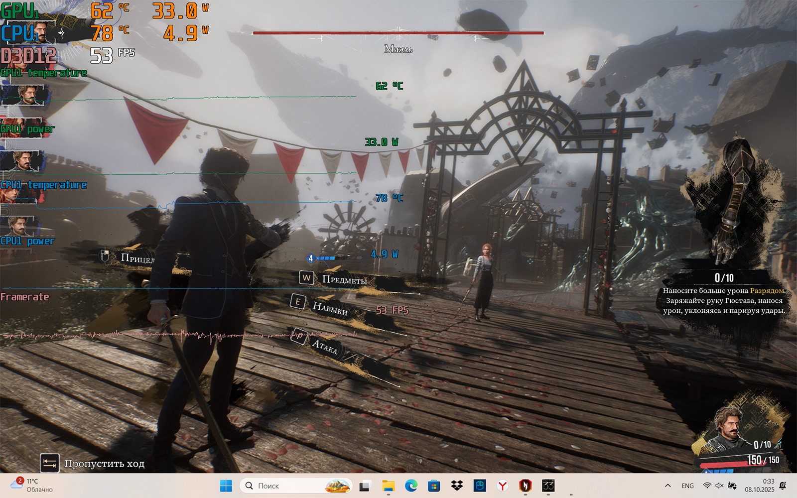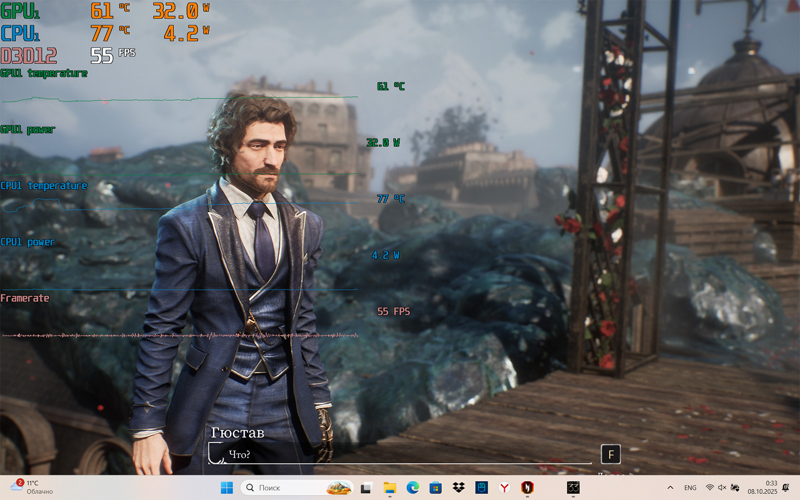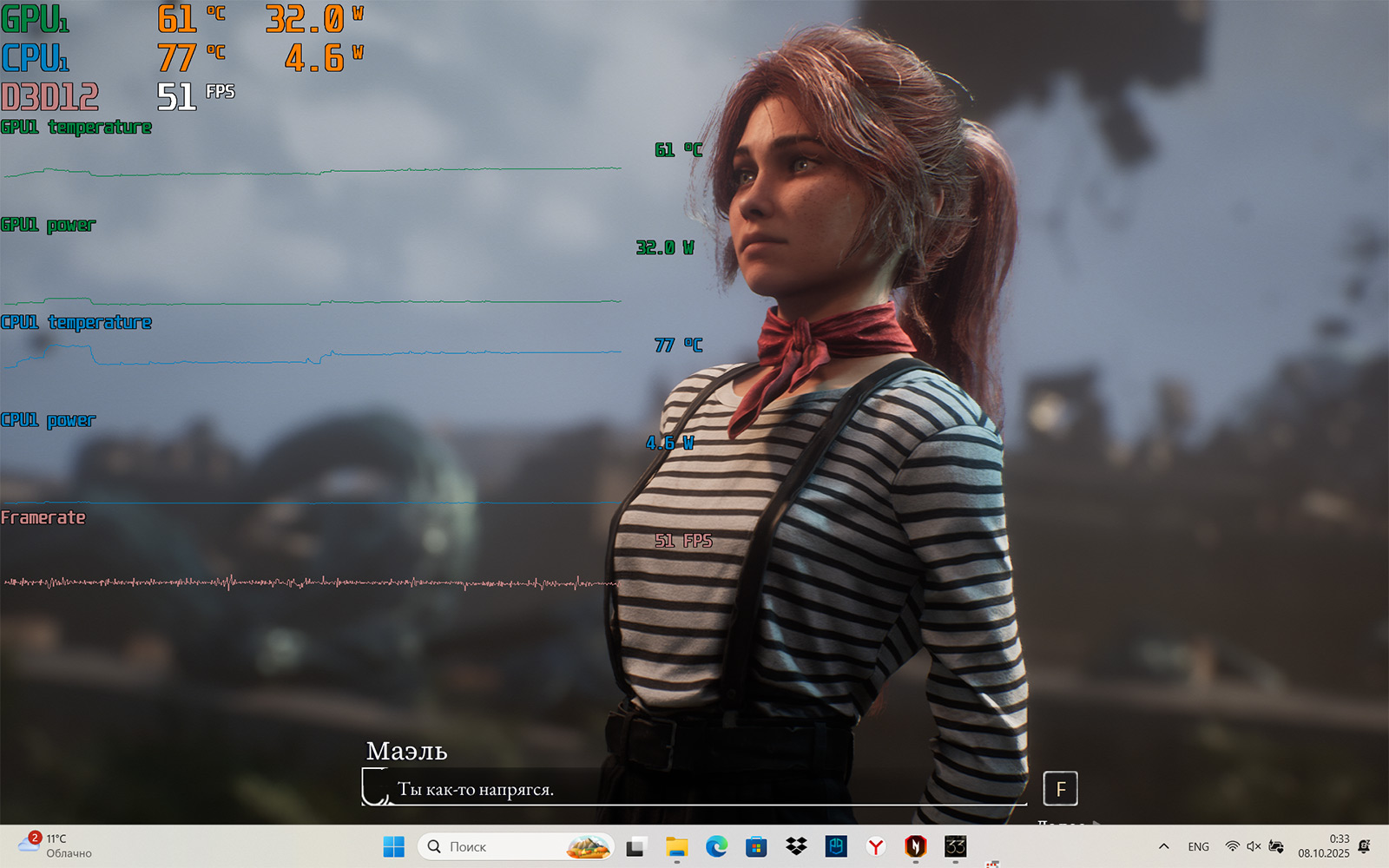 Немного о потреблении энергии. Видеокарта тянет до 85 Вт, и тут часто возникает вопрос: а как же блок питания всего на 135 Вт, если процессор потребляет еще 55 Вт? Все просто: я тестировал процессор и видеокарту отдельно. В реальной работе, когда оба компонента заняты одновременно, цифры ниже. Например, в игре процессор тянет до 30 Вт, а видеокарта до 50 Вт. В Claire Obscure процессор вообще максимум 5 Вт, а видеокарта — до 35 Вт. Так что все адекватно, нагрузка распределяется, и блок питания справляется без проблем.