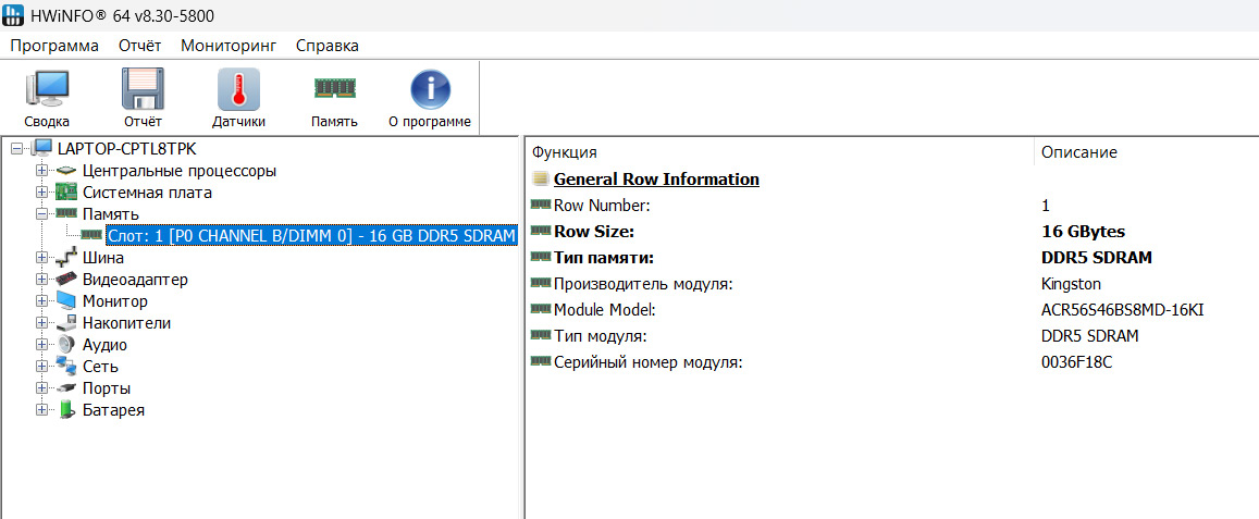 Планка установлена Kingston DDR5, модель ACR56S46BS8MD-16KI.