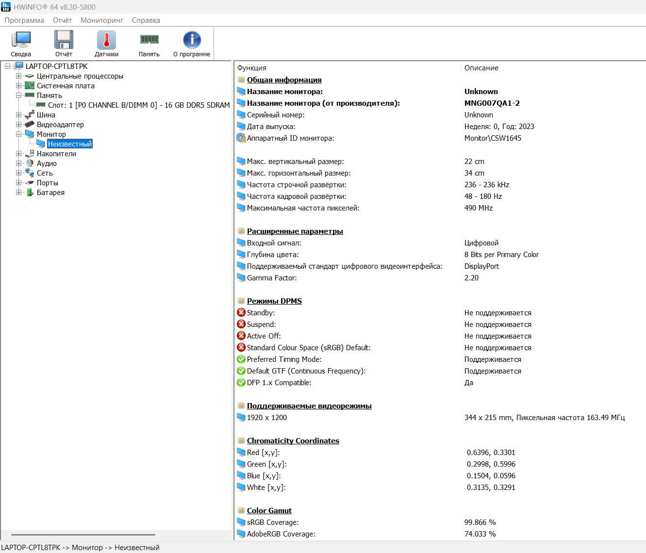 Экран | IPS, 16 дюймов. Разрешение 1920×1200 пикселей, 60/180 Гц, 16:10, 100% sRGB |