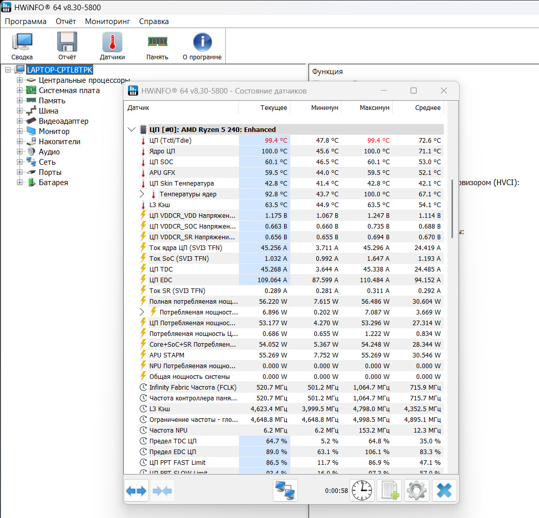 Во время тестов я заметил, что процессор потребляет до 56 Вт и в пиках нагревается до 100 градусов. Звучит пугающе, но на деле это нормально — система охлаждения справляется, троттлинга я не заметил. В среднем температура держится около 75 градусов, а шум кулеров появляется только при максимальной нагрузке. И даже тогда он не раздражает — скорее ровный гул, чем рев самолета.