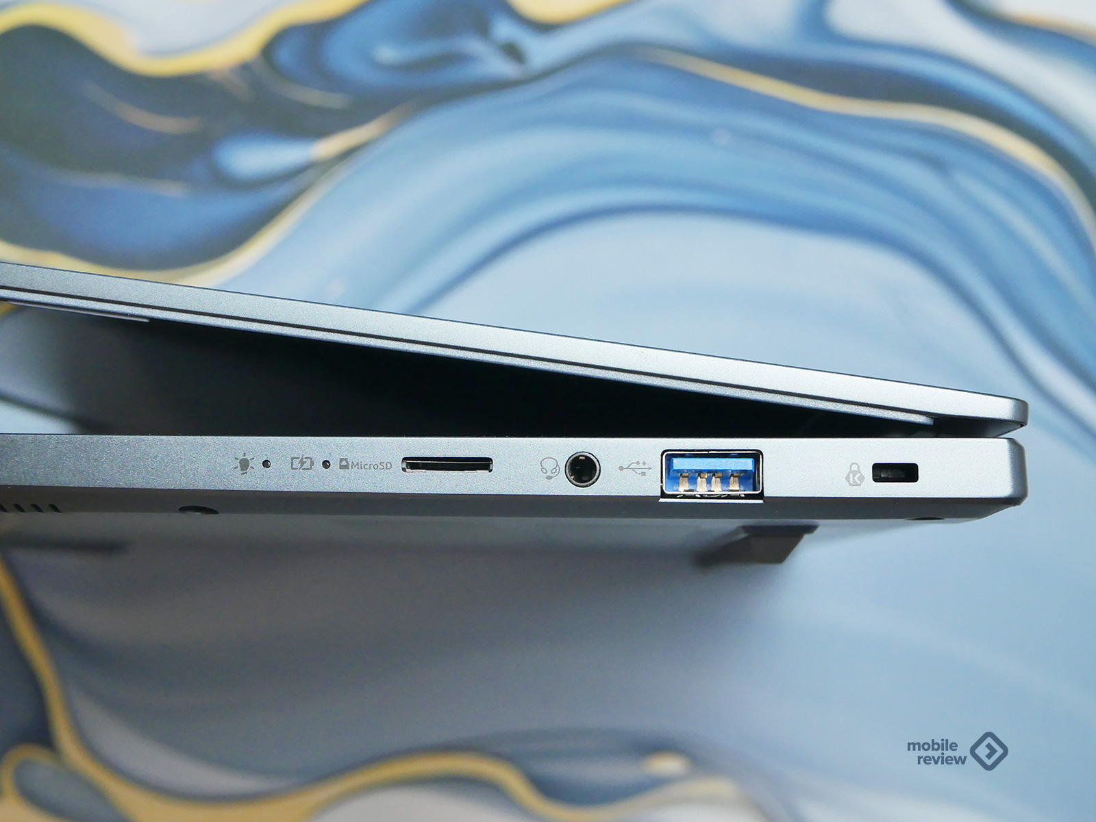 Справа тоже все по делу: есть Kensington Lock (чтобы ваш ноут кто‑то ненароком не унес), еще один USB Type‑A, аудиоразъем 3,5 мм (для любимых наушников) и — сюрприз! — слот для microSD. Довольно редкая фишка в современных ноутбуках, а ведь так удобно перекинуть фото с камеры или другого гаджета. Ну и пара индикаторов работы — чтобы всегда знать, что творится внутри железного друга.