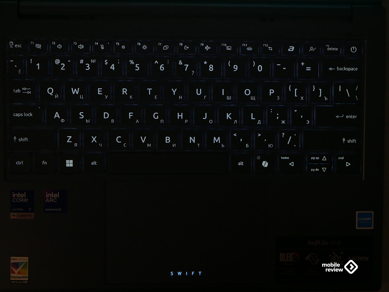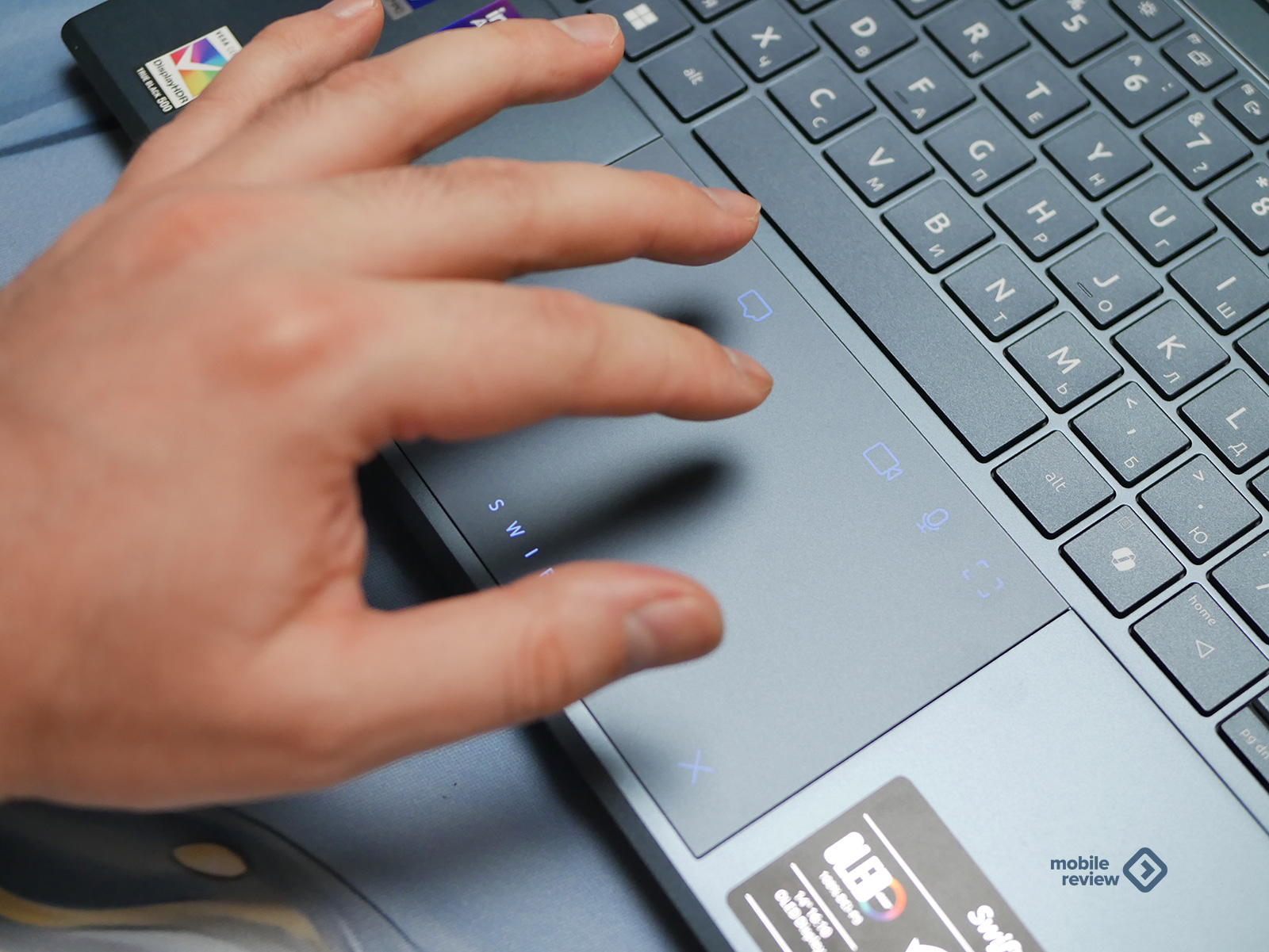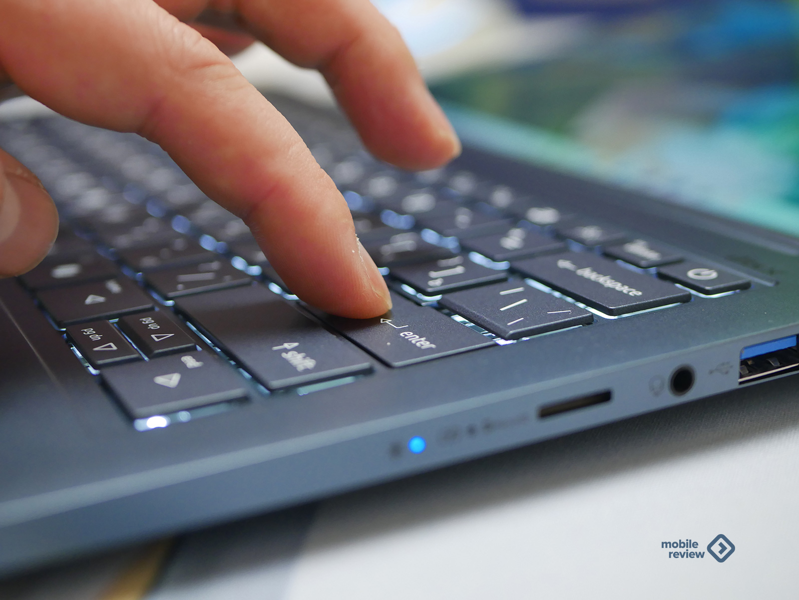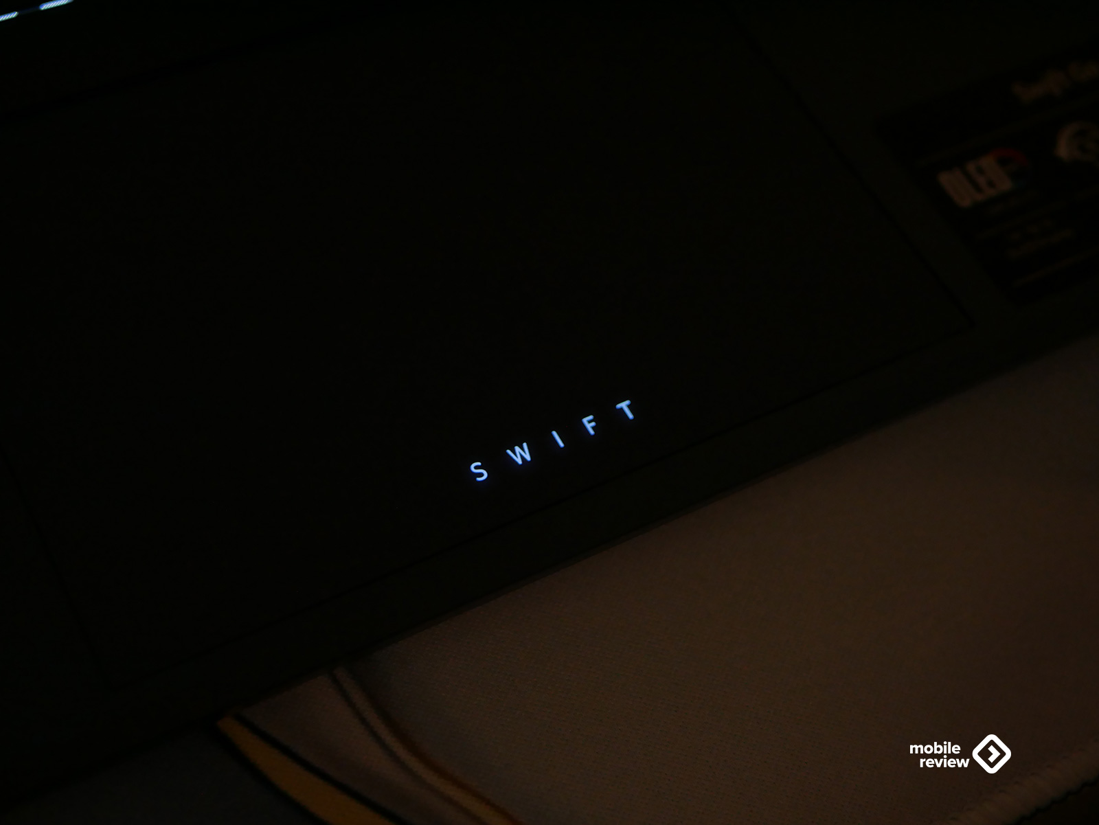 И еще один классный момент: когда открываешь крышку (она не заставляет приподниматься нижнюю часть ноутбука), на тачпаде загорается надпись Swift. Выглядит стильно! А если провести по ней пальцем, активируется дополнительная система управления — вот такая небольшая, но запоминающаяся «фишка».