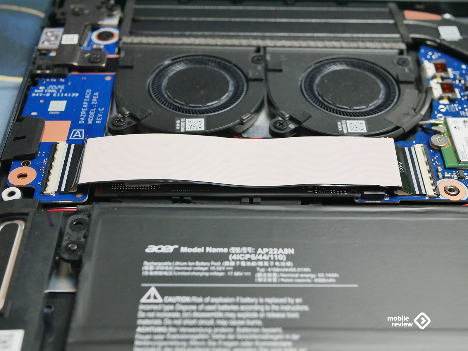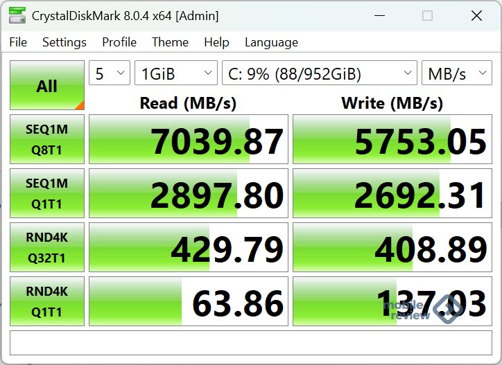 Теперь про накопитель. Тут один слот под SSD, и да, расположение не идеальное — над ним проходит шлейф к периферии. Но, честно говоря, это мелочь, которая вряд ли испортит вам жизнь. Зато то, что внутри, радует: 1 ТБ SSD PCIe 4.0 x4, который работает на полную катушку. Скорость — огонь (7000/5700 МБ/с).