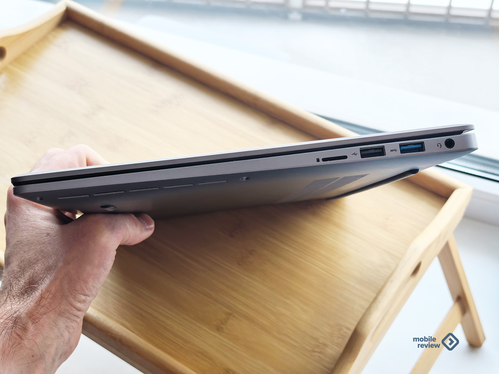 Ноутбук тонкий, но при этом тут полный набор портов. С правой стороны — microSD и два USB-порта.