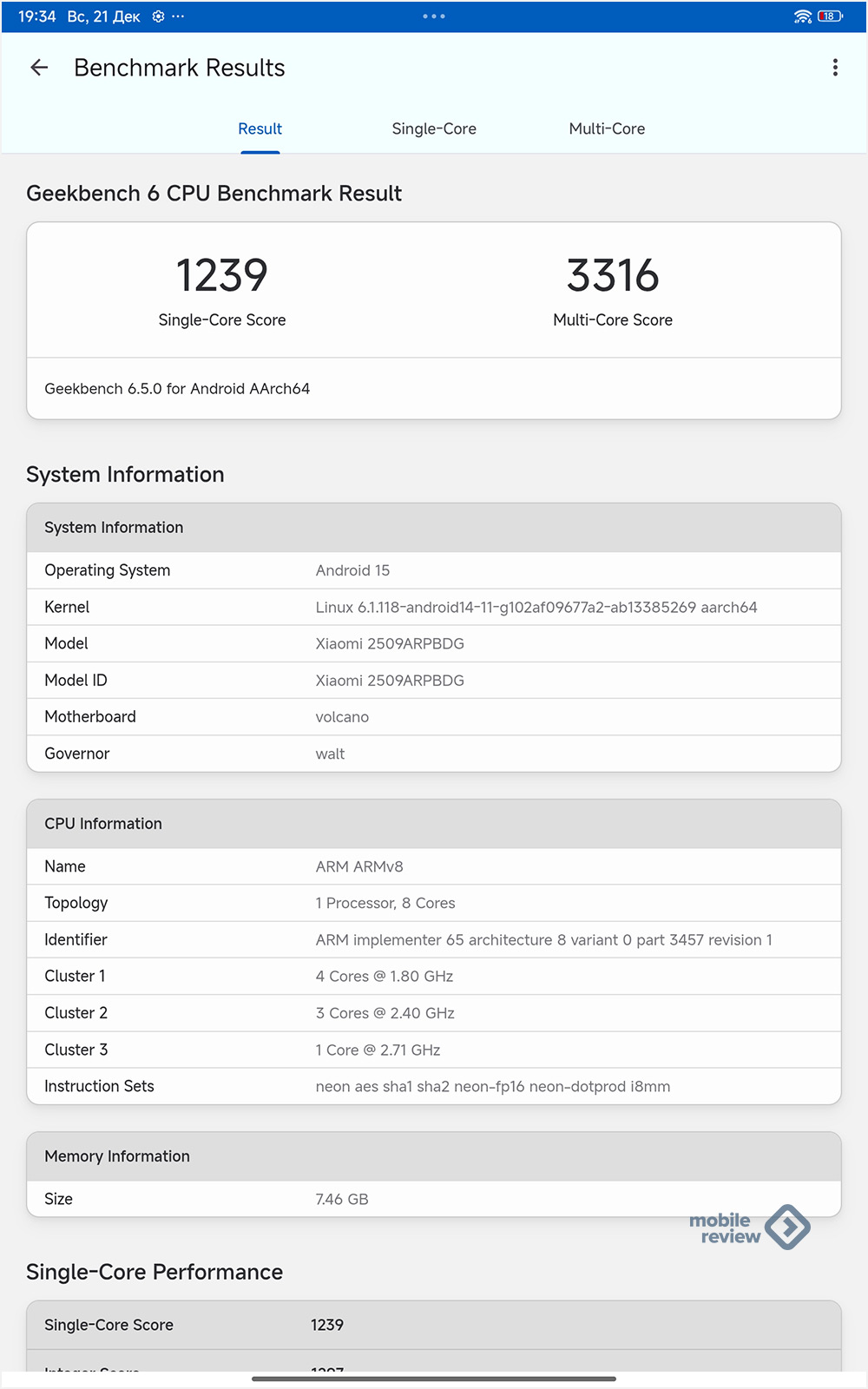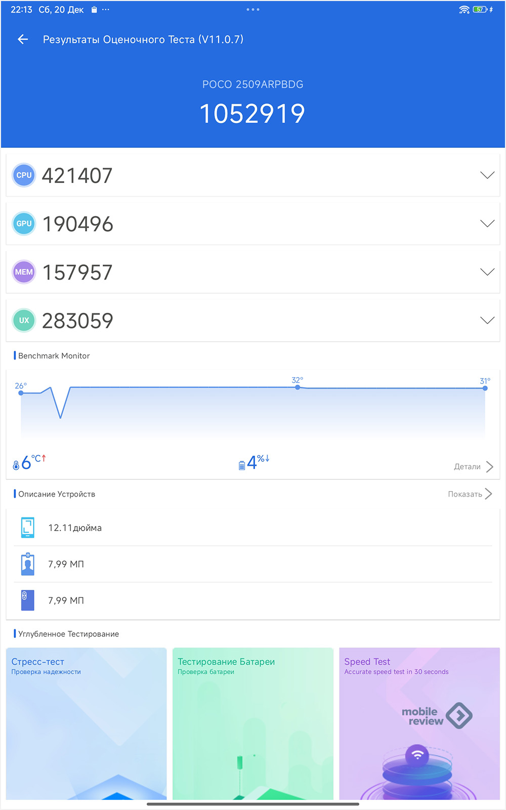 В тесте AnTuTu v11 планшет набирает чуть более 1 млн баллов (в AnTuTu v10 результат был бы около 770 тысяч баллов). Несомненный плюс конструкции планшета — это толстый металлический корпус. Благодаря ему чипсет легко отводит тепло, поэтому нет ни намека на троттлинг.