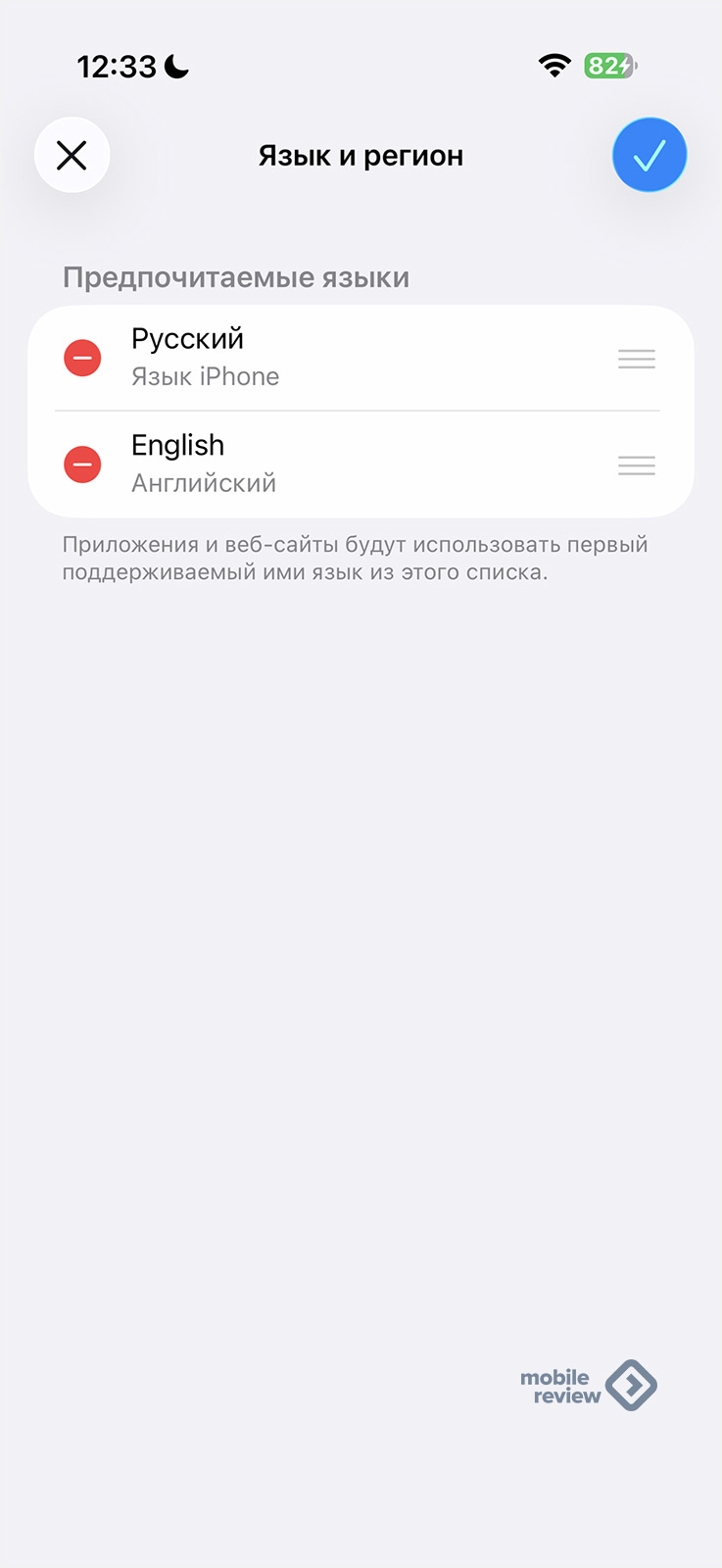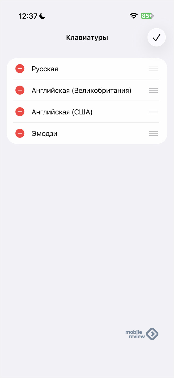 Вверху есть кнопка «Править», при ее нажатии вы попадете в меню, где можно удалить выбранные языки, но не выбрать нужный.