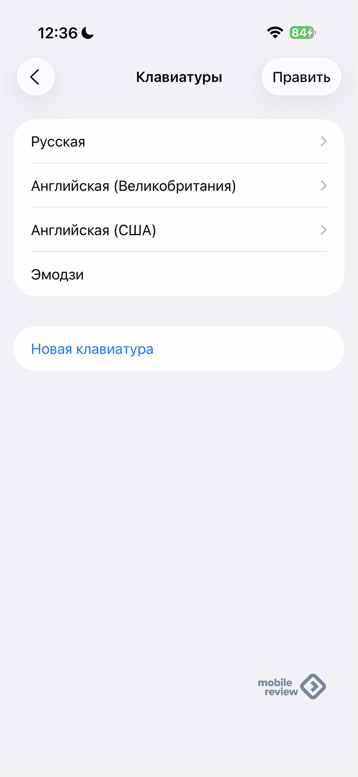 Давайте посмотрим на выбор клавиатуры в настройках. Перед вами список клавиатур, вы можете добавить новую, выбрав пункт внизу.