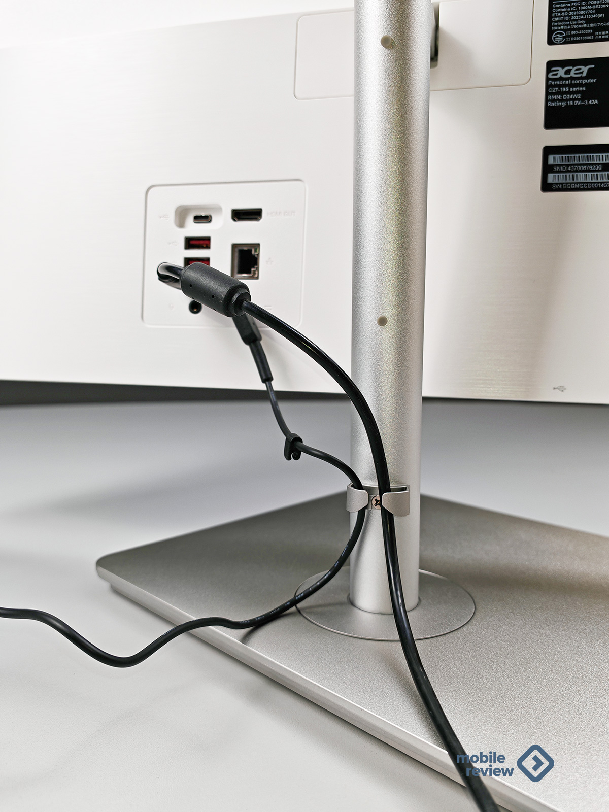 На ножке есть специальный зажим для проводов, который помогает организовать их, если у вас много подключаемой периферии. Не самое типичное оснащение — замок Kensington Lock, который тоже разместили на задней панели.