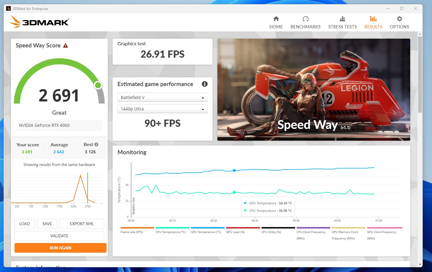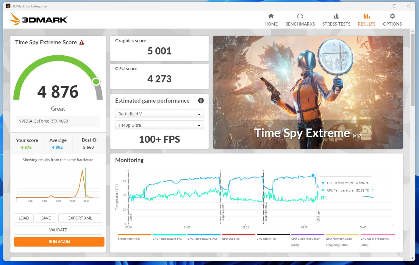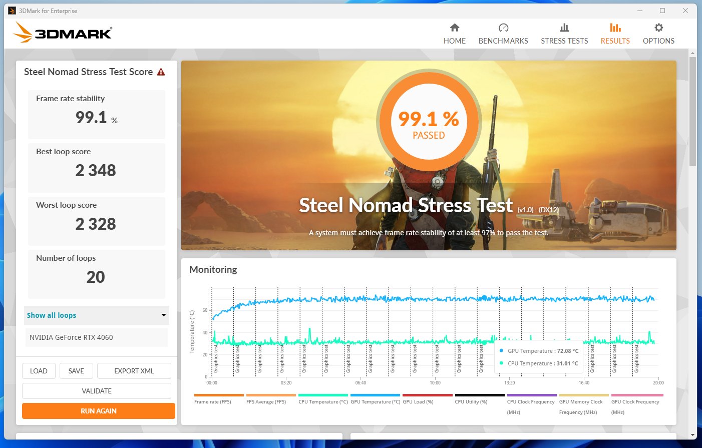 Благодаря отличному охлаждению в тестах производительности ПК показывает образцовые результаты. TDP процессора — 65 Вт, TDP видеокарты — 115 Вт, а мощность блока питания — 550 Вт, так что тут узких мест тоже нет. Посмотрите результаты стресс-теста 3DMARK. Система показала высокую оценку, при этом температура видеокарты составила всего 72 градуса.