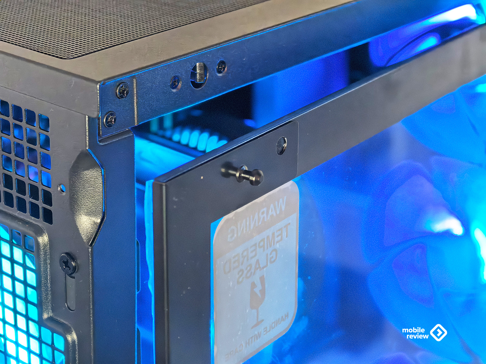 Боковая панель прозрачная. Она легко снимается для быстрого доступа к начинке ПК, На тыльной стороне компьютера есть выемка. Панель держится на двух клипсах. Чтобы снять, надо просто потянуть.