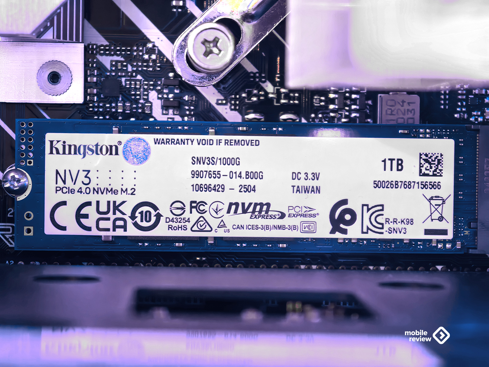 Под блоком процессора находится SSD-диск Kingston емкостью 1 ТБ SSD M.2 PCIE 3.0. В принципе, до него легко добраться. Системный блок можно заполнить памятью. Сюда поместится ещё 4 диска SATA 6 Гб/с (кабели для подключения есть в комплекте) и один SSD M.2 PCIE 3.0.