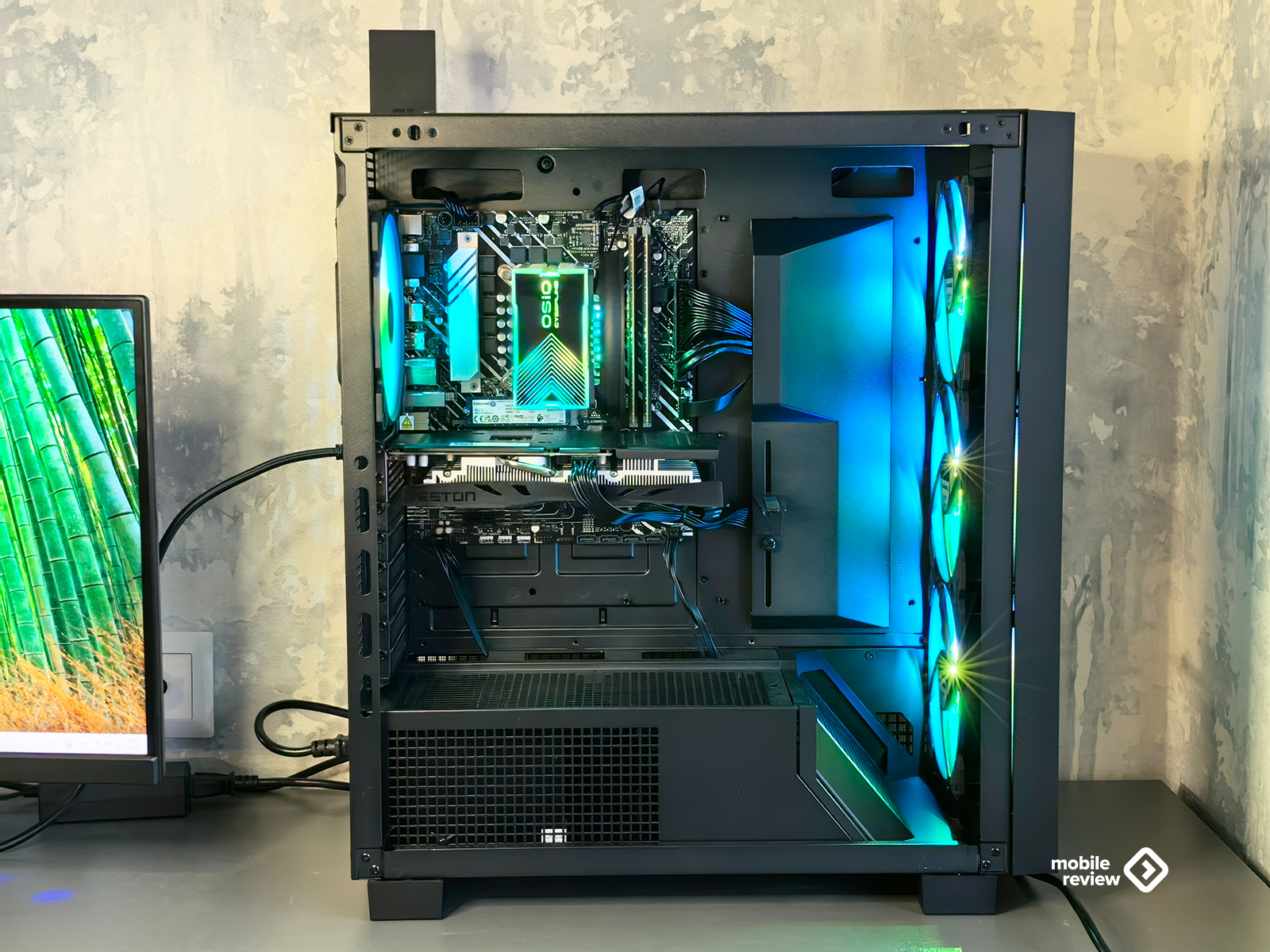 Материнская плата тут с сокетом LGA1700. На неё можно ставить процессоры вплоть до 14-го поколения Intel. Так что формально производительность ПК может вырасти после апдейта примерно в 3 раза. Блок питания мощностью 550 Вт позволит это сделать. Под процессором находится видеокарта GeForce RTX 4060 8 ГБ.