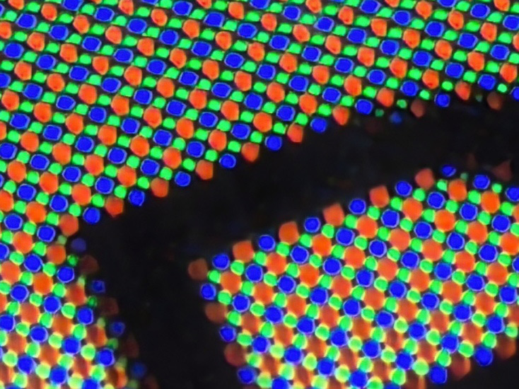 - Разрешение 2750 на 1260 точек, плотность пикселей 459 ppi. Без микроскопа отдельный пиксель не разглядеть. Под микроскопом пиксели выглядят вот так (см. ниже). Напомню, что в AMOLED-дисплеях для отображения черного цвета пиксели просто отключаются.