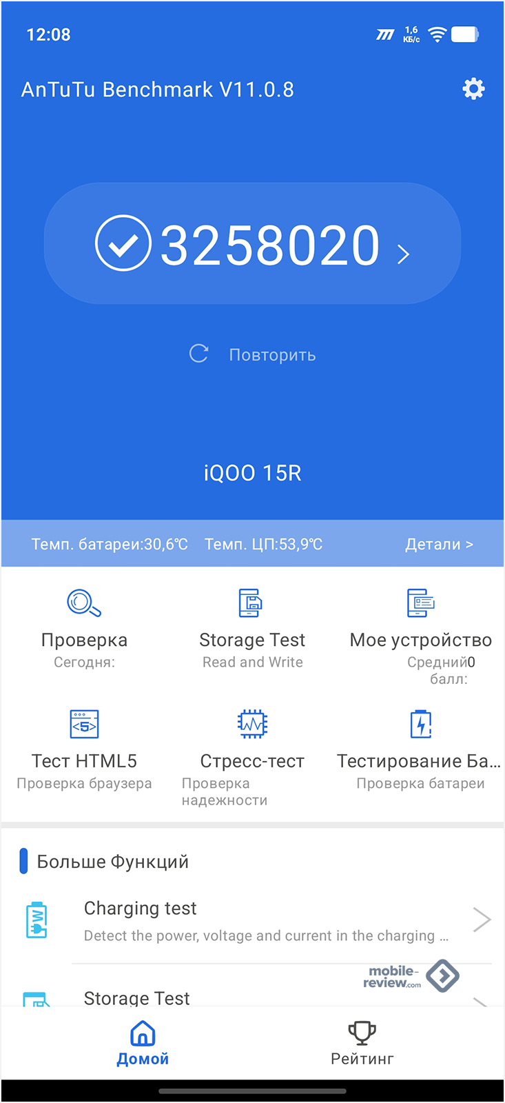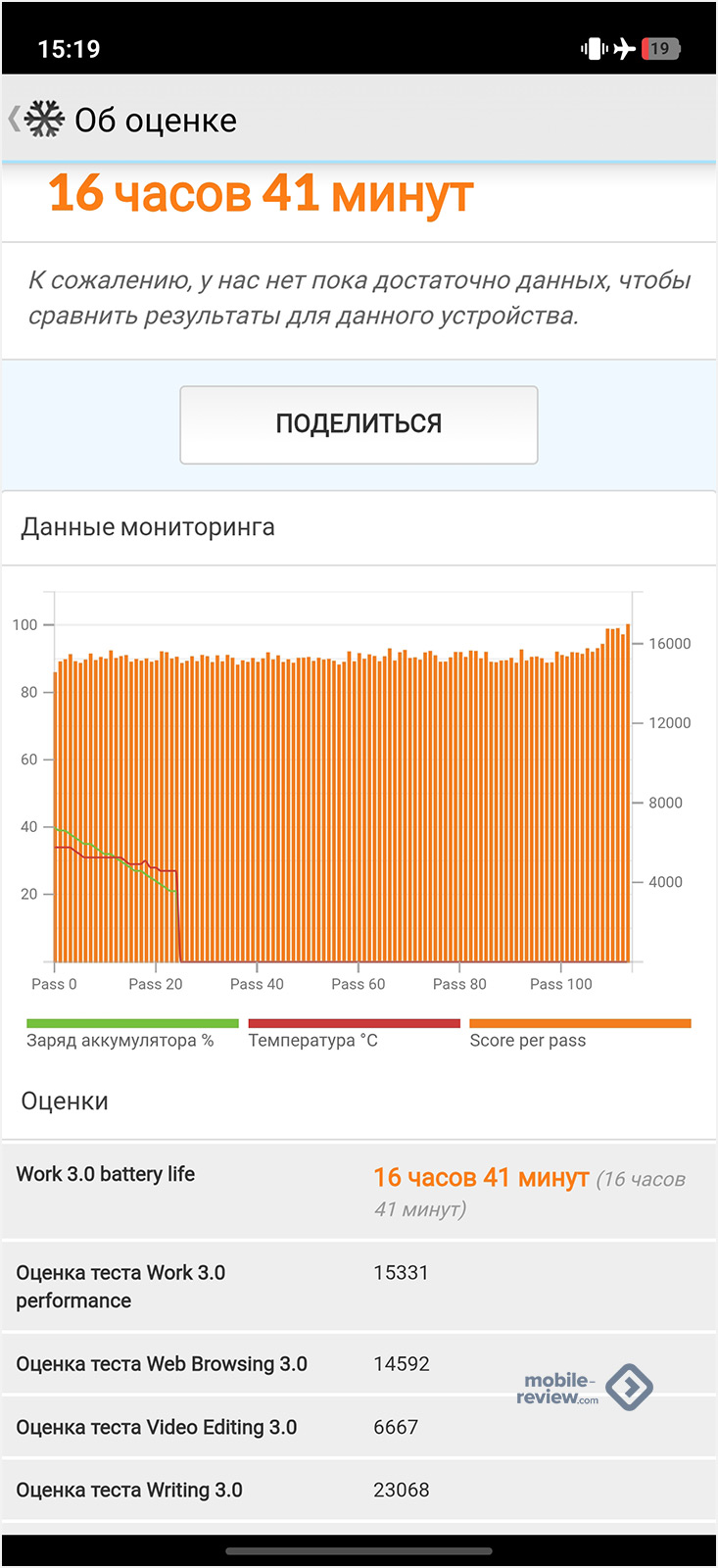 В тесте PCMARK с максимальной ручной яркостью экрана (800 нит) iQOO 15R продержался феноменально долго — 16 часов 41 минуту.